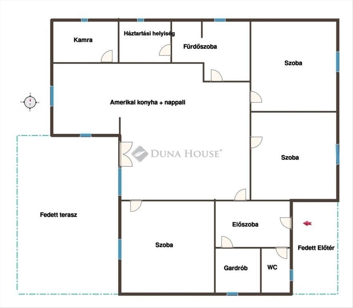 Helyiségei: 3 tágas szoba, amerikai konyha+nappali, kamra, fürdőszoba, háztartási helyiség, gardróbszoba, wc, külön wc+kazánház, előszoba, fedett előtér és egy hatalmas fedett terasz