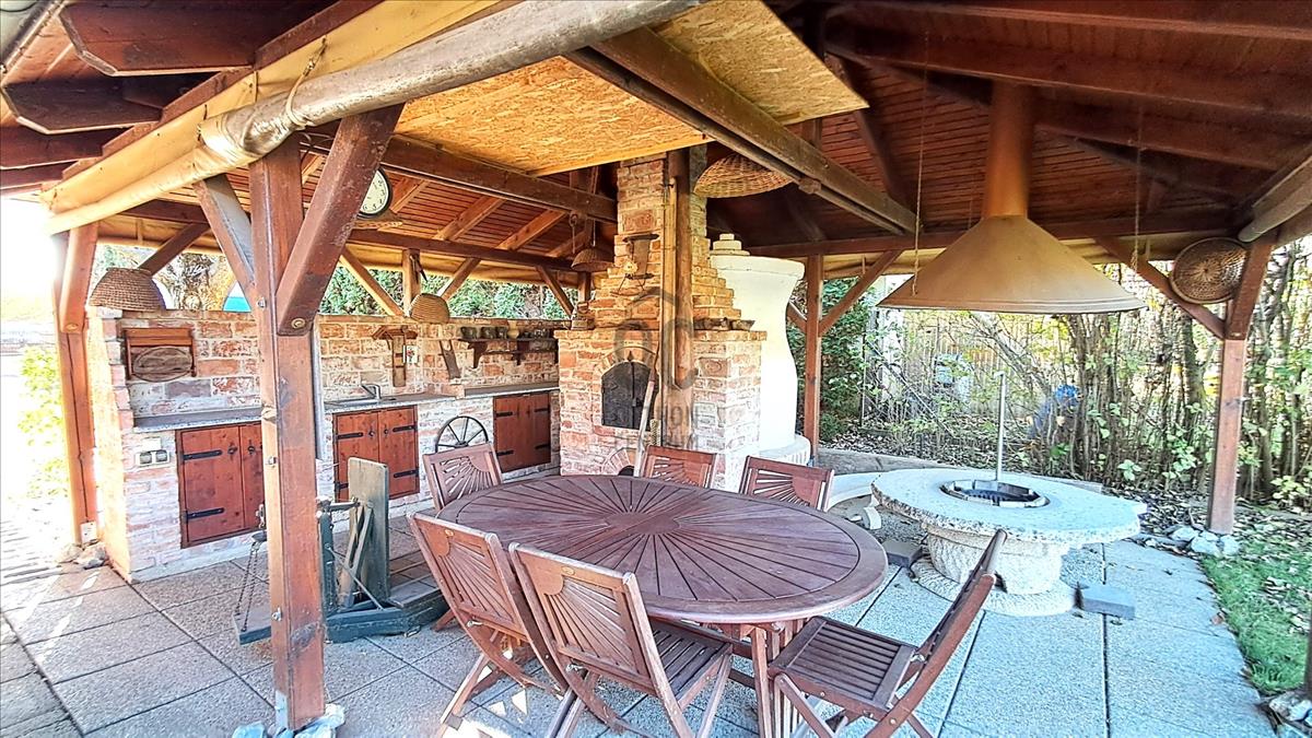 --a kertben van egy fa szerkezetű filagória, búboskemencével, bográcsozóval, kinti konyhával és étkezőhellyel