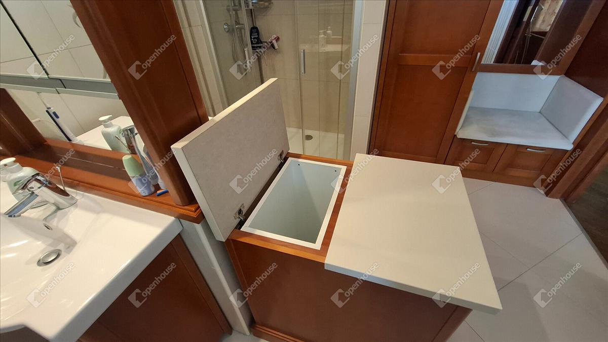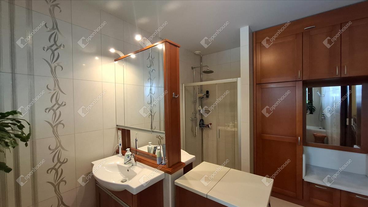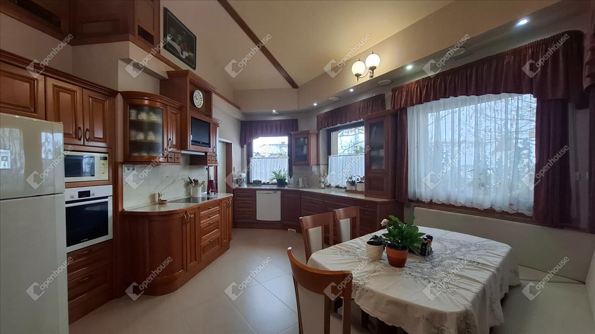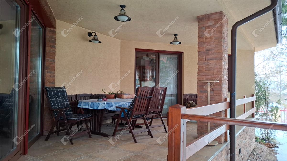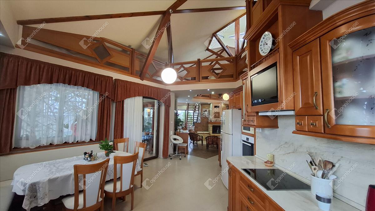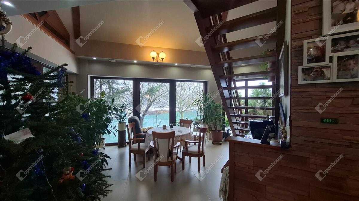 A családi ház felső szintje 170 négyzetméter, a fő nappali egy vizes grillezős kandallóval, egyterű konyha étkezővel, egy nagy terasszal, télikerttel. a nappaliból nyílik a fő hálószoba beépített gardróbbal, saját terasszal, fürdőszobával. a fürdőben két külön mosdóhely, fürdőkád, zuhanyzó, beépített szekrények, szennyes ledobó a lenti mosókonyhába.