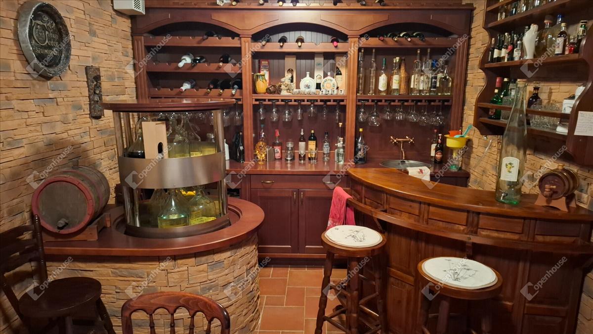 A családi ház földszintje 190 négyzetméter, belépve egy kis előszoba és egy tágas nappali fogad. a nappaliból nyílnak: konditerem, kamra, kazánház, mosókonyha, borospince. a borospincében beépített italos pult és ásott kút is van elektromosan működtethető italos hűtőrendszerrel. Kis külön folyosón fürdőszoba jakuzzival, zuhanyzóval, külön wc, és egy szauna plusz infra kombináció egybeépítve.
