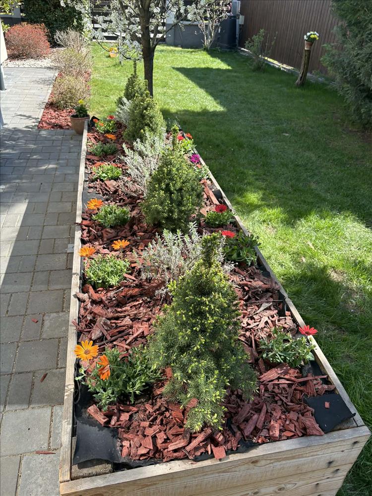 A 635nm -es, öntőzőrendszerrel és esővíz szikkasztóval ellátott, parkosított kert medencével, játszótérrel, valamint főzési lehetőséggel bővül ki. a telek végében betonalapra épült, 10nm -es kisház, fedett bográcsozóhely, valamint a hátsó kertre néző 20nm -es terasz is szolgálja az itt élők kényelmét.