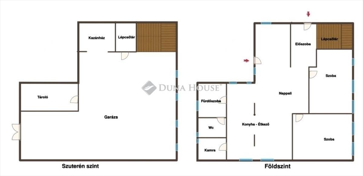 -Földszint: tágas előszoba, óriási amerikai konyhás nappali étkezővel, kamrával, két teljes értékű hálószoba, kádas fürdőszoba, külön WC.