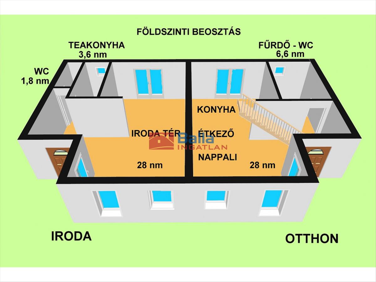 A másik lakrész, mely irodának volt használva nappali, étkező, konyha és Wc helységekkel rendelkezik. a teljes alsószint igény szerint könnyen összenyitható.