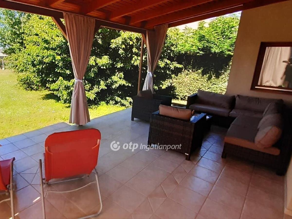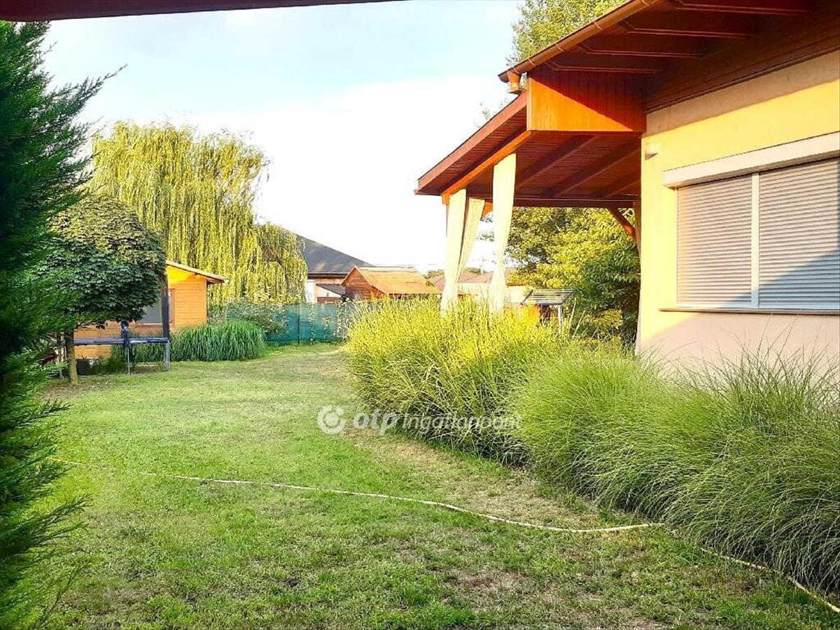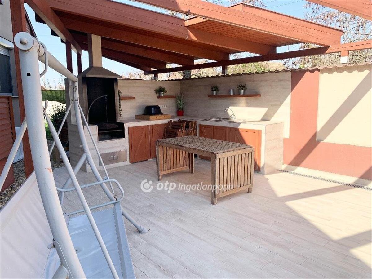 Az ingatlanba belépve egy tágas, széles előszoba tárul elénk, ahonnan nyílnak a helyiségek. Hatalmas, modern, minden igényt kielégítő konyhai gépekkel szerelt konyha bárpulttal és nagy étkezőasztallal, tágas, modern nappali hófehér dekorfallal és szekrényekkel kijárattal a teraszra, 3 szoba, beépített szekrények, két fürdőszoba, mosókonyha, amely gardróbszoba is, illetve egy pazar árnyékolható, intim környezetet biztosító fedett terasz nyújtja a kényelmet és a nyugalmat. a pezsgő élet helyszíne pedig a ház előtti részben található pergolás, nagyrészt fedett kerti sütögető és az ehhez tartozó minden igényt kielégítő kemence, mosogató, előkészítő pultok, nyolc személyes kerti bútor. Mellette szintén fedett külön tárolórész a bicikliknek, supnak, motornak, amelyek a környék felfedezésére, a mintegy 50 méterre található tavak kihasználására szuper lehetőséget kínálnak. Ha pedig a napi kondíciónkat szeretnénk karban tartani, és egyéb sportra vágyunk csak a hátsó kertig kell mennünk, ahol egy külön 16 m2 es, 32 m2-es betonalapú szigetelt faházban egy modern, szinte új gépekkel felszerelt kondi terem vár minket. Ennek betonozott terasza alkalmas lehet jakuzzi, vagy medence felállítására is, de a hátsó kert is bőven ad lehetőséget akár nagyobb medence, vagy gyermekeknek játszótér kialakítására, ehhez a több helyen kialakított kerti csap is nagy segítség. Gyönyörű zöld tujákkal, pampafüvekkel határolt a ház és a telek, a kertben jónéhány termő gyümölcsfa rügyezik.