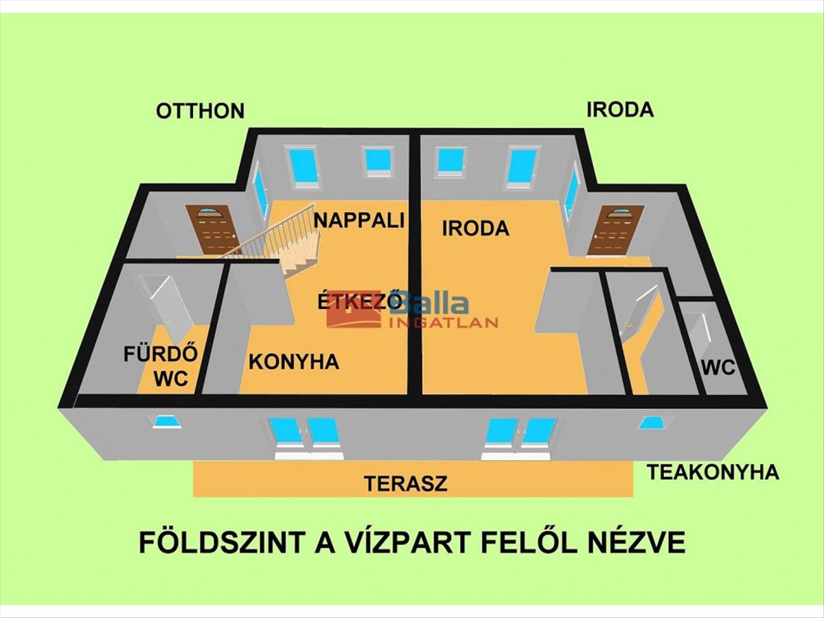 A másik lakrész, mely irodának volt használva nappali, étkező, konyha és Wc helységekkel rendelkezik. a teljes alsószint igény szerint könnyen összenyitható.