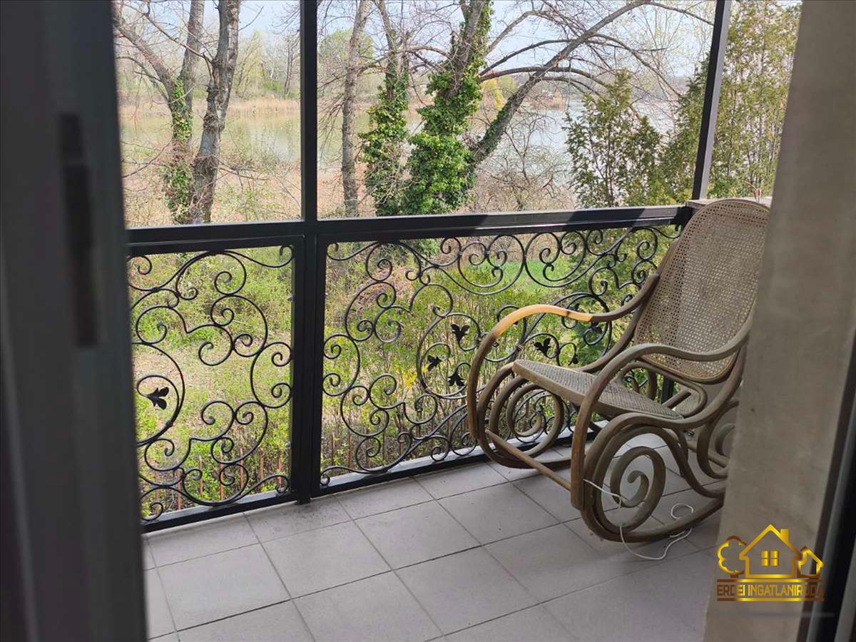 Alsó szinten gépesített amerikai konyha, nappali, kisebb félszoba különleges kilátással a tóra, toalett zuhanyozóval kapott még helyet.