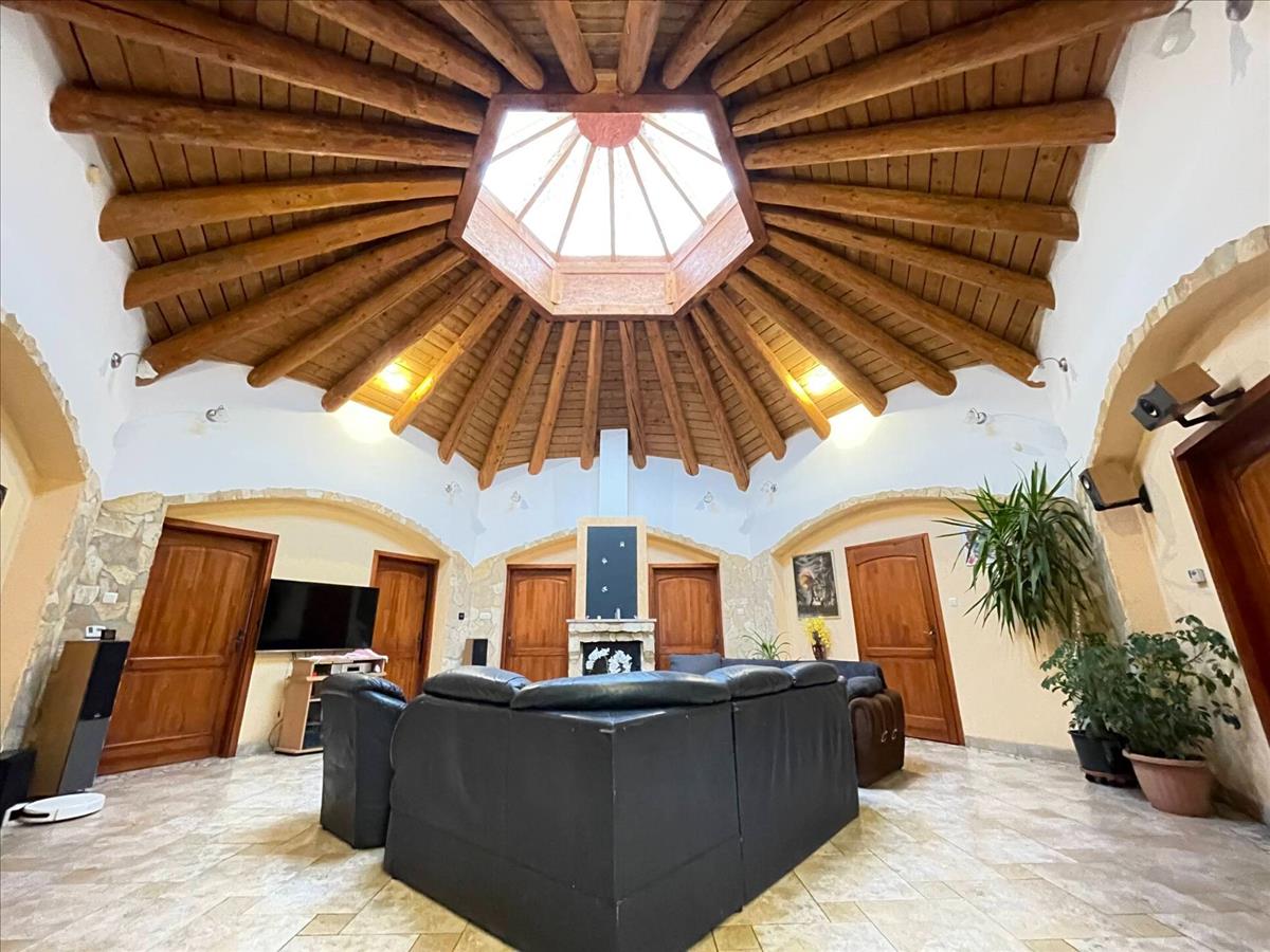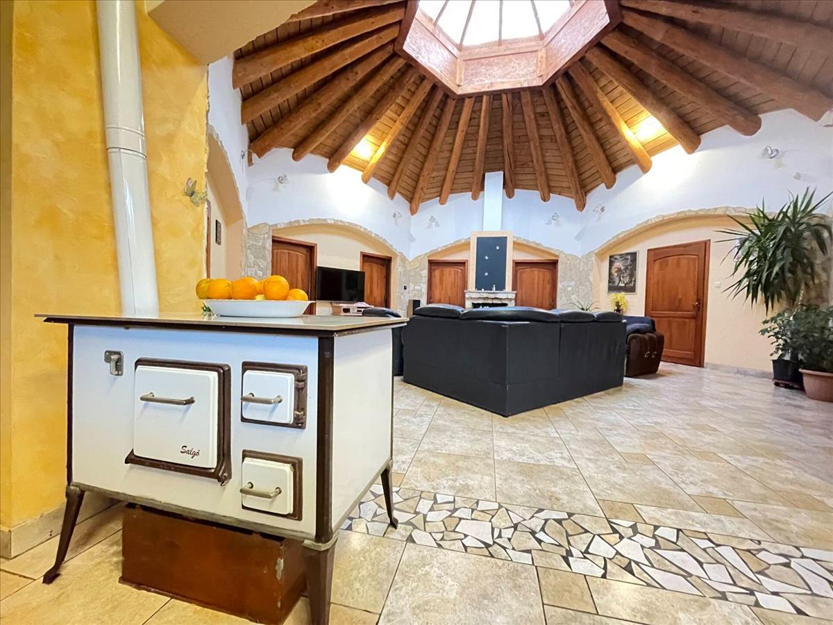 A központi tér egy 60 m²-es, nagy belmagasságú amerikai konyhás nappali, ahol a rönkgerendás födém és a kupolaablakon beáradó természetes fény egészen különleges atmoszférát teremt.
