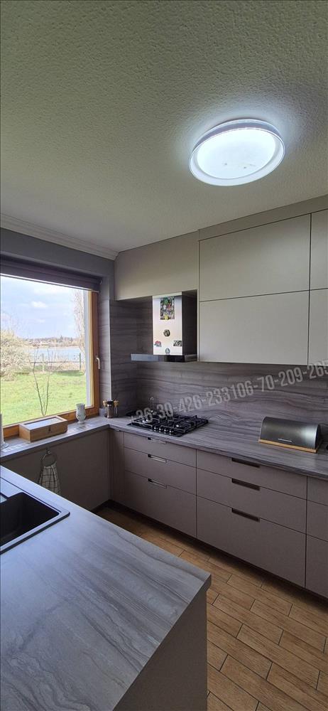 A nagyobbik lakásban a modern, új konyhabútor gépesítve az eladás részét képezi. Mivel a konyha ablaka a tóra néz, így azon keresztül gyönyörködhetünk a csodás panorámában.