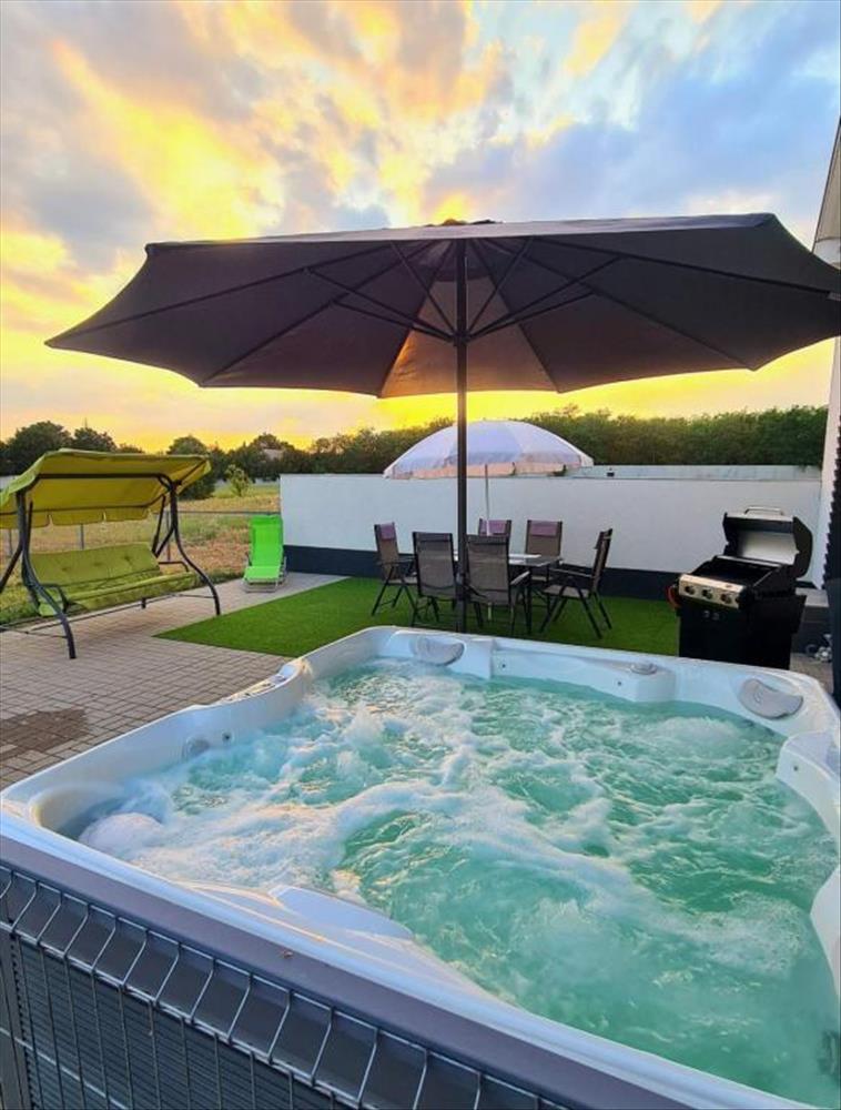 - Jacuzzi, hangulatos térkövezett felületek, kerti kiülő