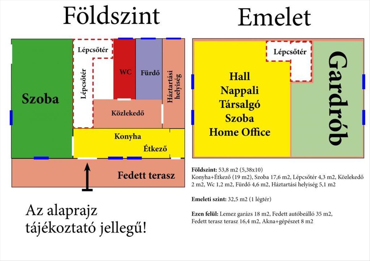 Földszint: 53, 8 m2 (Konyha+Étkező (19 m2), Szoba 17, 6 m2, Lépcsőtér 4, 3 m2, Közlekedő 2 m2, Wc 1, 2 m2, Fürdő 4, 6 m2, Háztartási helyiség 5, 1 m2)