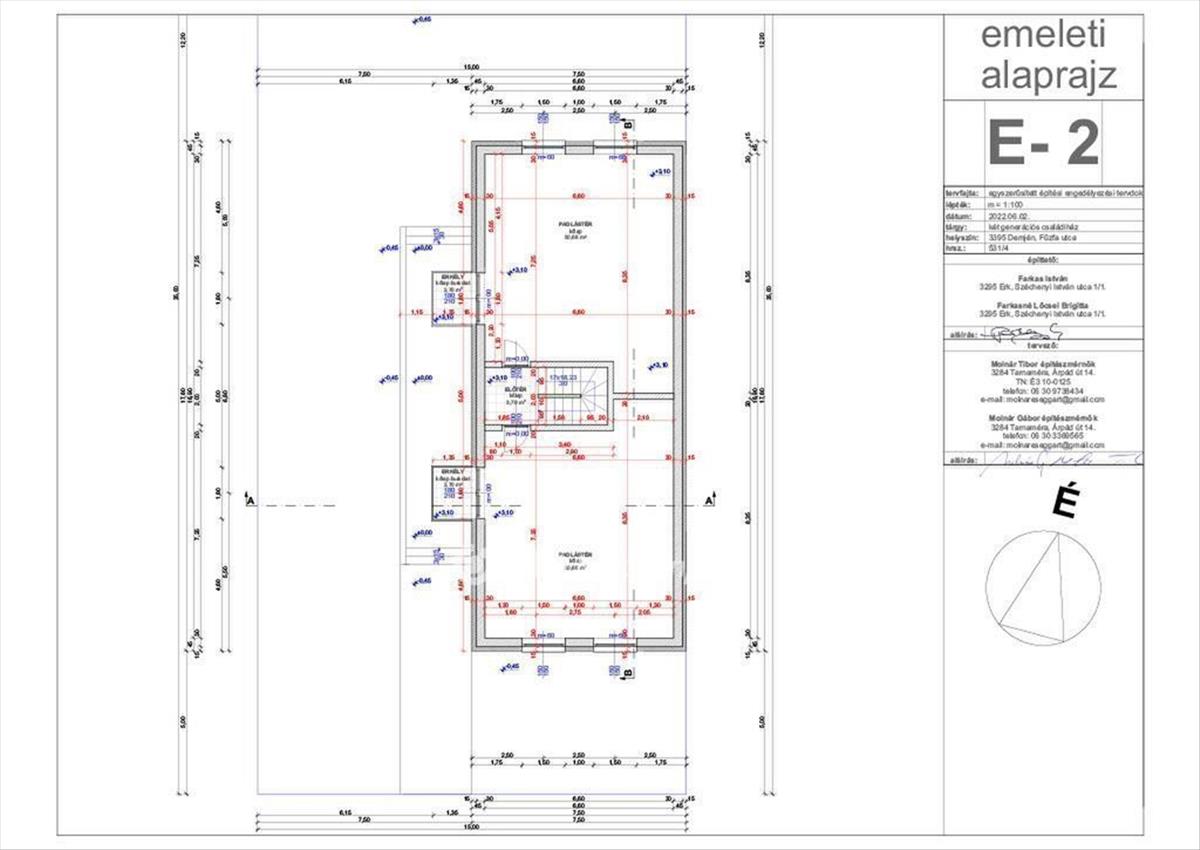 Emelet (2 db x 50, 68 m2): Jelenleg szerkezetkész, szabadon alakítható terek! Tervek szerint mindkettő 2 szobás, erkélyes lakásnak készül.