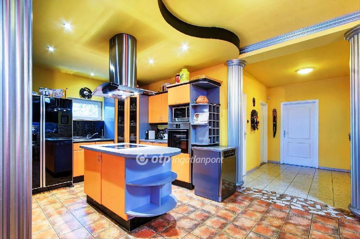A házba lépve az előszobán keresztül a tágas közlekedőbe jutunk, ahonnan a kiváló elosztásnak köszönhetően nyílik szinte minden földszinti helyiség, a vendégszoba, a fürdőszoba, a háztartási helyiség a cirkó kazánnal, vízszűrő-rendszerrel és a mosógéppel, a tágas kádas fürdőszoba és toalett, valamint egy tároló. a közlekedőből a hangulatos akváriummal körbevett étkezőbe és a minimál stílusú konyhába jutunk, ahonnan továbbhaladva az impozáns egyedi kialakítású, 5, 5 m belmagassággal rendelkező hatalmas 45, 8 m2-es nappaliba érünk, mely a ház lelke, a mai kornak megfelelően berendezve, minden igényt kielégítő, a belmagasságnak köszönhetően kiváló akusztikával rendelkezik.