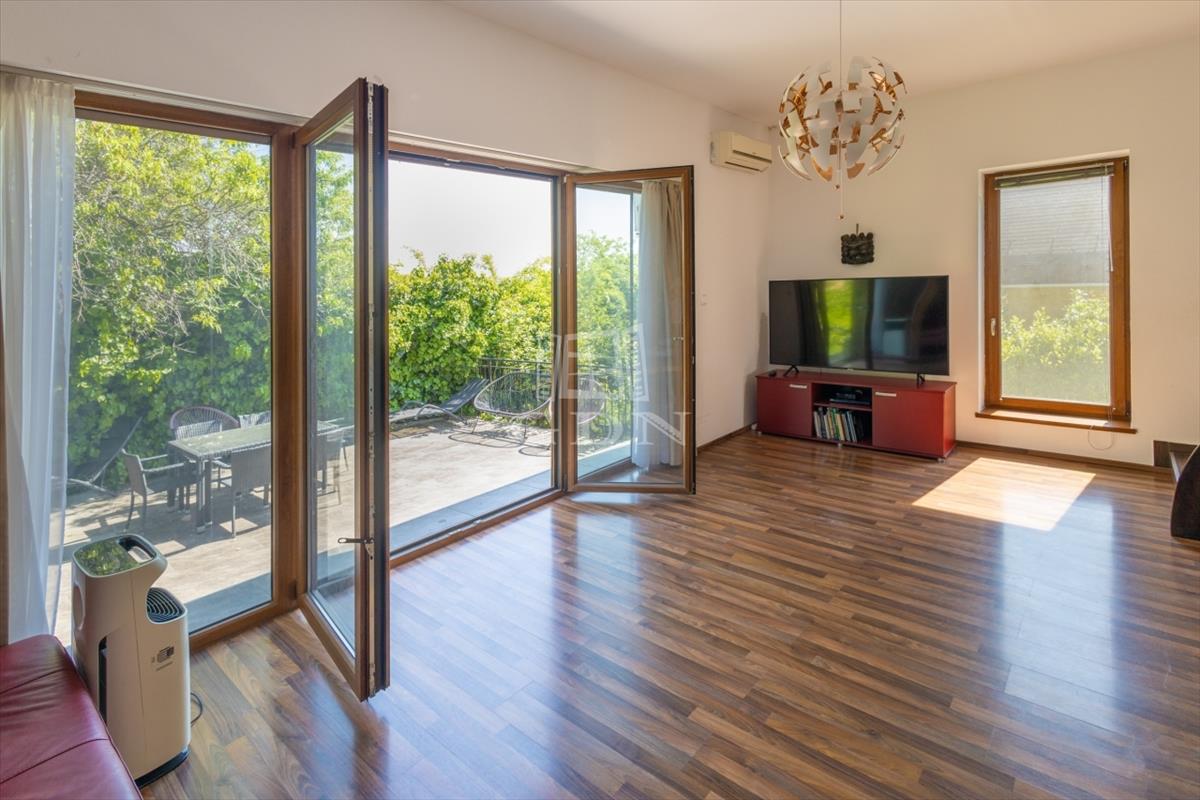 A nappali közvetlen kapcsolatban áll a 38 m²-es terasszal és a kerttel, amely kiváló helyszín családi reggelikhez vagy baráti összejövetelekhez.