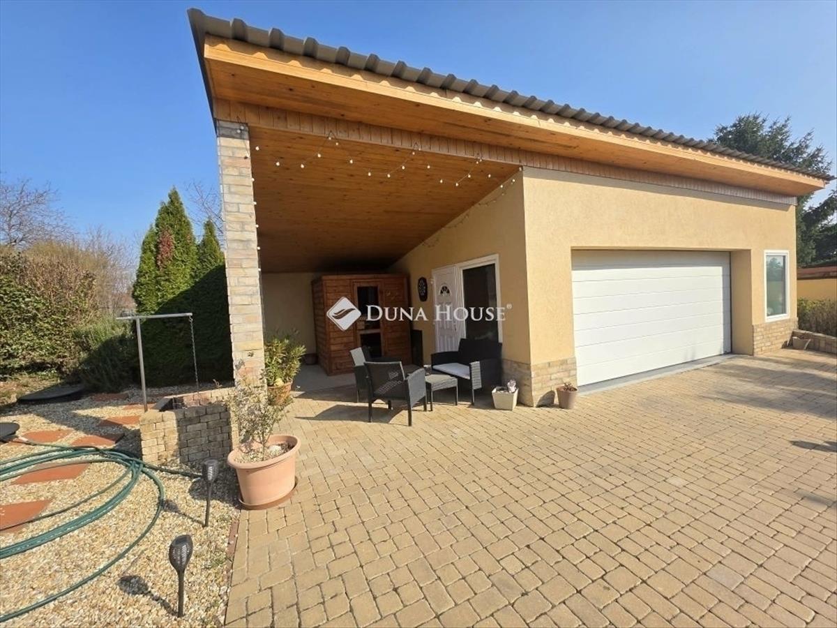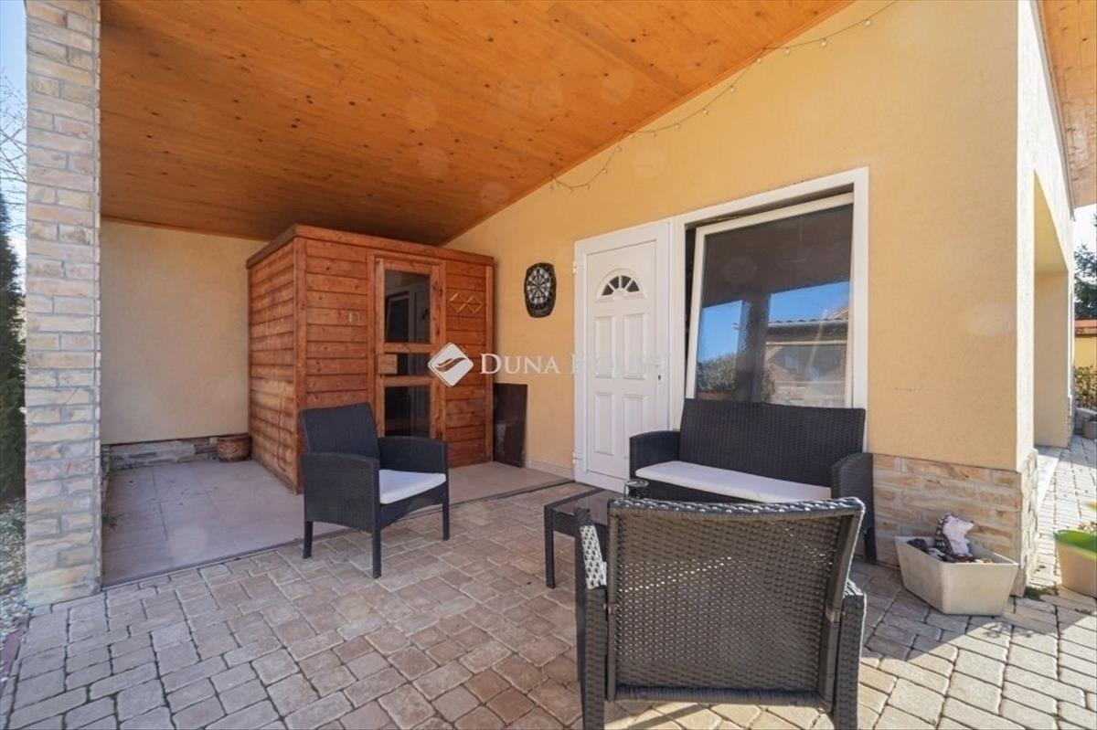 Diósd kedvelt, nyugodt részén eladó egy önálló családi ház, amely nyeles telken helyezkedik el, így lakói számára valódi privát szférát és csendes környezetet biztosít. Az ingatlan az utcáról közvetlenül nem látható, átmenő forgalom nincs, ezért különösen ideális családoknak vagy azoknak, akik nyugodt, zavartalan otthont keresnek. a ház nettó 115 m² lakótérrel rendelkezik, amely praktikus és jól élhető elrendezésű. Főbb területek:Lakótér: 115 m²Garázs: 40 m² (két autó számára is alkalmas)Szaunarész: 10 m²Közlekedő: 10 m²Nappaliból nyíló terasz: 40 m²A lakótér kényelmes kialakítású: 3 különnyíló hálószoba, 2 fürdőszoba, 2 wc és egy dolgozószoba került kialakításra. a világos nappali közvetlen kapcsolatban áll a tágas, 40 m²-es terasszal, amely ideális helyszín lehet pihenésre, családi étkezésekre vagy baráti összejövetelekre. Az ingatlan egyik különlegessége a saját szaunarész, amely ritkán található meg ebben a kategóriában, és kellemes kikapcsolódást nyújt a mindennapokban. a 40 m²-es garázs két autó számára is kényelmes parkolást biztosít, emellett bőséges helyet ad tárolásra vagy akár hobbitér kialakítására is. a nyeles teleknek köszönhetően a ház csendes, belátásmentes környezetben található, így ideális választás lehet mindazok számára, akik hosszú távra keresnek nyugodt, élhető otthont.