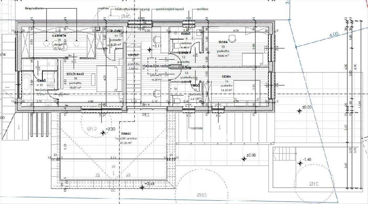 A ház szerkezete 30-as tégla falazat, 15 cm szigetelés, 30 cm födém szigetelés, színezett nyílászárók, zsaluziával. Fűtése hőszivattyús rendszerű, mennyezet hűtés-fűtéssel, szellőztető rendszerrel. Burkolatok 8000 Ft/nm-ig választhatók.