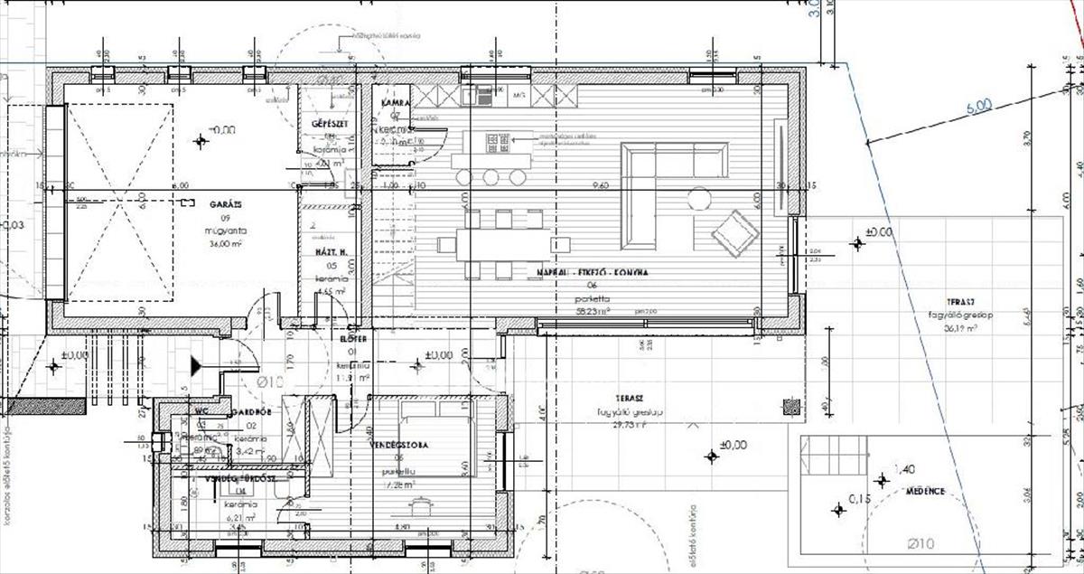 A ház jól átgondolt alaprajzi elrendezéssel bír, megfelelő méretű közös térrel rendelkezik, minden szobához saját fürdőszoba, némelyikhez gardrób tartozik. a kétszintes épület hasznos területe 245 nm, melybe a teraszok nincsenek beleszámolva. a földszinten két állásos garázsban kényelmesen elfér két autó, a hátsó felén a gépészeti helyiség található. Bejárattal rendelkezik a lakás felé. Hatalmas nappali-amerikai konyha-étkező a fő életteret biztosítja 58 nm-en. a konyhából kamra is nyílik. a ház bejáratához közel egy vendég szoba kapott helyet saját fürdőszobával. Az előszobából egy praktikus gardrób nyílik, a szemben lévő oldalon pedig egy háztartási helység. a nappali hatalmas terasz ajtóval, és sok nyílászáróval kialakított, rendkívül világos. Két nagy teraszra jutunk ki, mely körbeöleli a medencét, ami 6X3-as méretű, gépészettel ellátott. Az emeleten egy tanuló helység fogad, alkalmas emeleti nappalinak is. Az egyik oldalon két szoba, saját fürdőszobákkal, a másik oldalon a szülői háló, saját fürdőszobával és gardróbbal helyezkedik el. Innen egy 41 nm-es teraszra tudunk kilépni.
