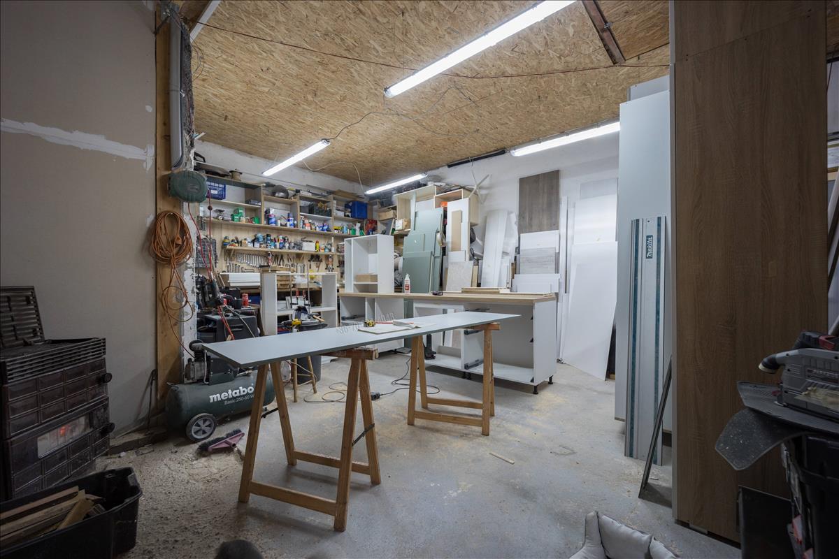 A folytatásban egy 29m2-es garázs található, ahol van áram és fűtési lehetőség, illetve egy 36, 70m2-es fedett tároló. a tároló előtt egy sütögető rész lett kialakítva, amely kiválóan alkalmas lehet családi és baráti összejövetelekre.