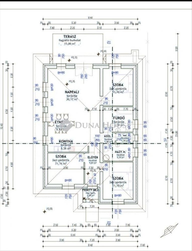 Dömsöd csendes utcájában megvételre kínálok, egy gondosan megtervezett, kiváló elrendezéssel rendelkező nettó 96nm , bruttó 124nm -es családi házat. a tágas élettérben három hálószoba, amerikai konyhás nappali, előtér, közlekedő, háztartási helyiség fürdőszoba wc-vel és külön illemhelyiség lett kialakítva. Családi összejövetelek tökéletes helyszíne lehet a 15nm -es fedett terasz. a szobák laminált parkettákkal még a többi helyiségek kerámia lappal lesznek burkolva. a lakás fontos helyiségei kedvező keleti-déli-nyugati tájolásúak. Az épület a kerthez egy nyitott terasszal kapcsolódik. Az ingatlan melletti oldalkertben van lehetőség legalább két gépjármű parkolására, ami murvás kialakítással biztosított, azonban külön megállapodás alapján térköves burkolat is igényelhető. . a kerítés szürke színű elektromos úszókapuval ellátott. Az ingatlan műszaki adatai: 30-as porotherm téglából épül beton sáv alapon, tetején monolit vasbeton lemez készül 10cm vastagságban 15/15/6 hálós vasalással Födéme fa, szigetelés:15+10 cm hőszigetelés, tükörfólia, gipszkarton, aluprofil Homlokzat :15cm eps szigetelőlemez Lábazati : 10cm xps lemez Aljzat :15cm xps lemez Tetőfedés: Tetőszerkezet hagyományos szerkezetű sátortetős kialakítású fedélszerkezet 25 fokos hajlásszögű tetővel, tetőszerkezet anyaga fűrészelt fenyő, Leier beton cserépfedéssel, antracit színnel Meleg vízellátását és fűtését hőszivattyú biztosítja, hőleadása padlófűtésen keresztül történik. Nyílászárók ötkamrás műanyag szerkezetű nyílászáró szerkezetek, bukó-nyíló kialakítással, háromrétegű hősszigetelő üvegezéssel. a hozzá tartozó külön elkerített telek területe 615nm Lakóház nettó területe: Pontos méretei:- előtér 4, 65 m2 - kerámia burkolat - közlekedő 1, 50 m2 - kerámia burkolat - nappali 30, 17 m2 - lam. Parketta - konyha 6, 56 m2 - kerámia burkolat - étkező 6, 43 m2 - kerámia burkolat - fürdő 7, 50 m2 - kerámia burkolat - háztart. H. -Tároló 5, 10 m2 - kerámia burkolat - wc. 1, 70 m2 - kerámia burkolat - szoba 11, 10 m2 - laminált parketta - szoba 11, 10 m2 - laminált parketta - szoba 11, 16 m2 - laminált parkettaA lakás lakóterület nettó alapterülete: 96, 97 m2 - ebből szobák: 63, 53 m2 + fedett bejáró 2, 09 m2 - fagyálló burkolat + Egyéb: nyitott terasz 15, 00 m2 - fagyálló burkolatAz ingatlan minden hitelkonstrukcióknak megfelel. Hívjon bizalommal a hét bármely napján. FIX 3% lakáshitelre megvehető