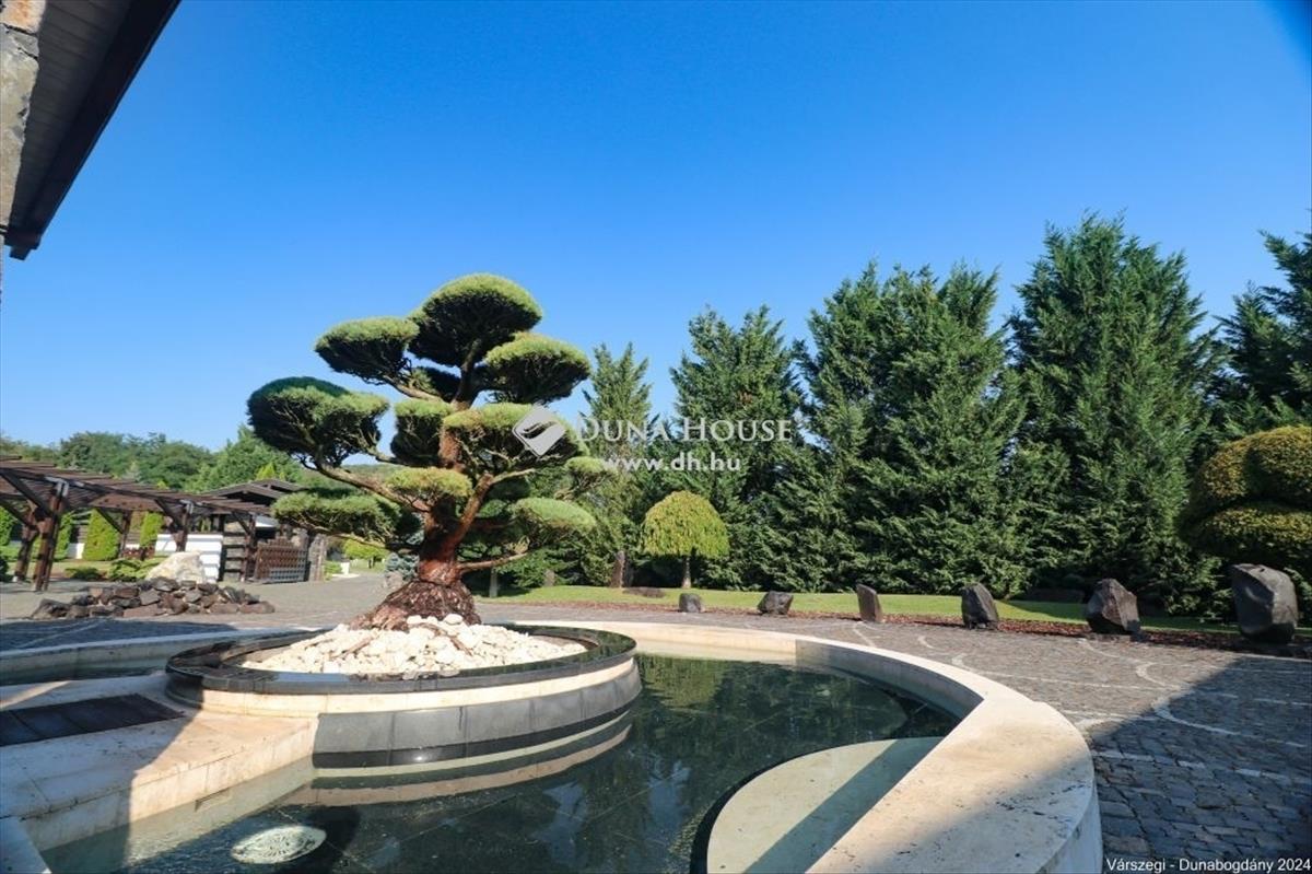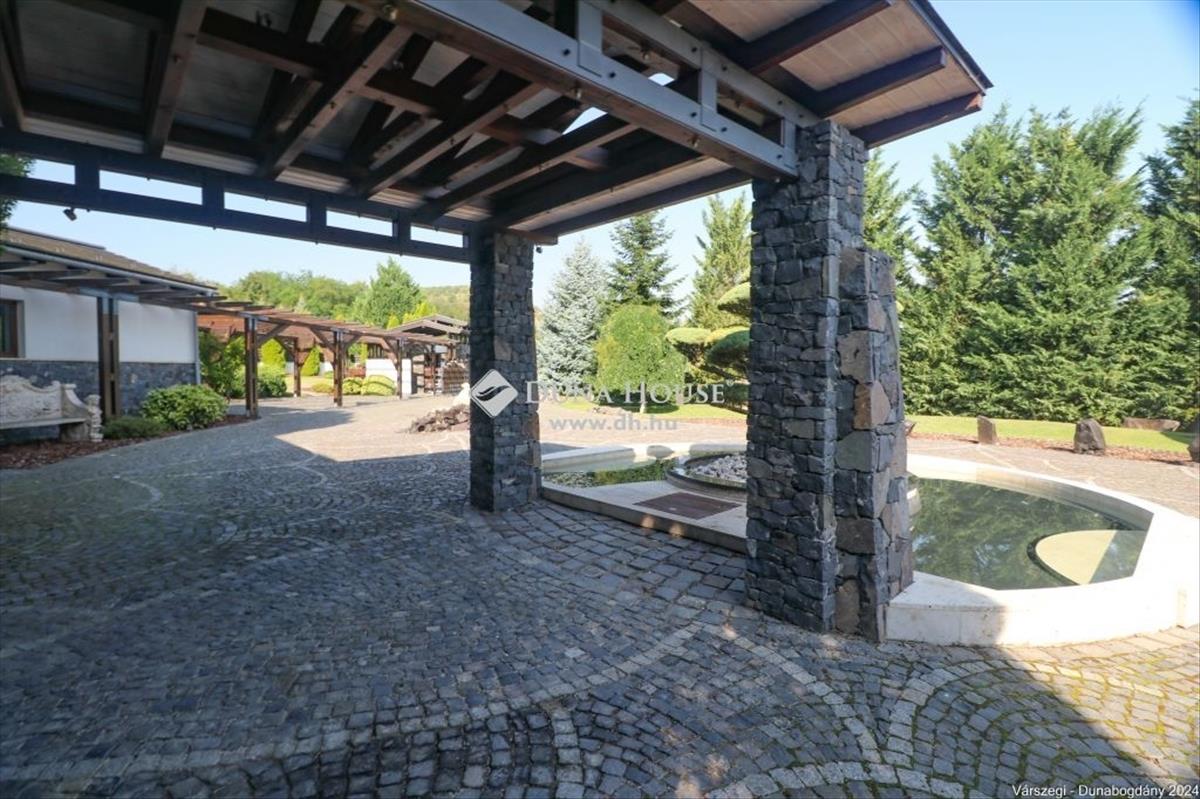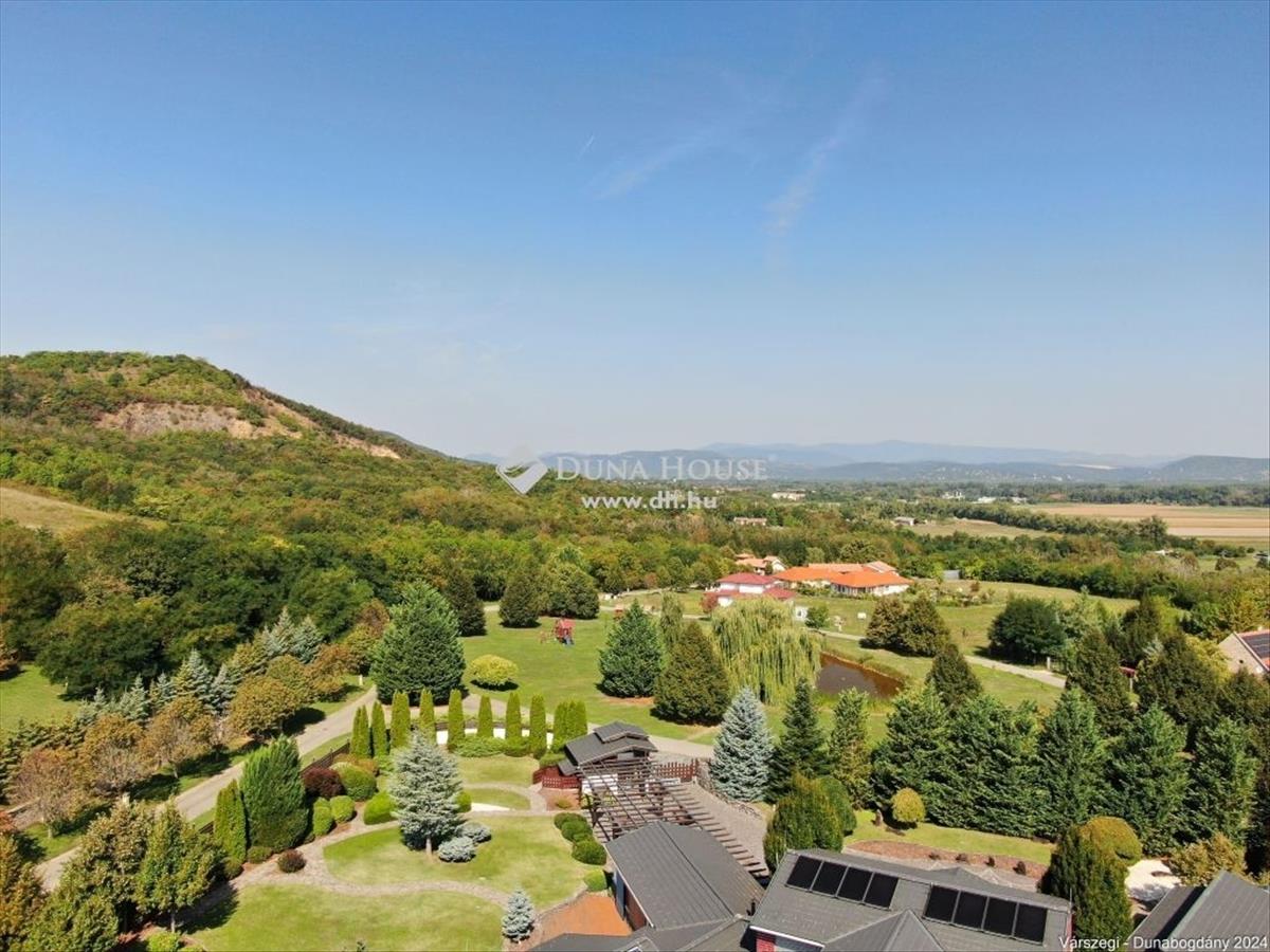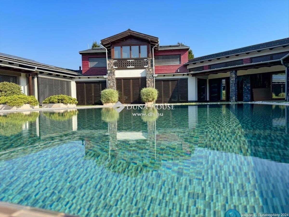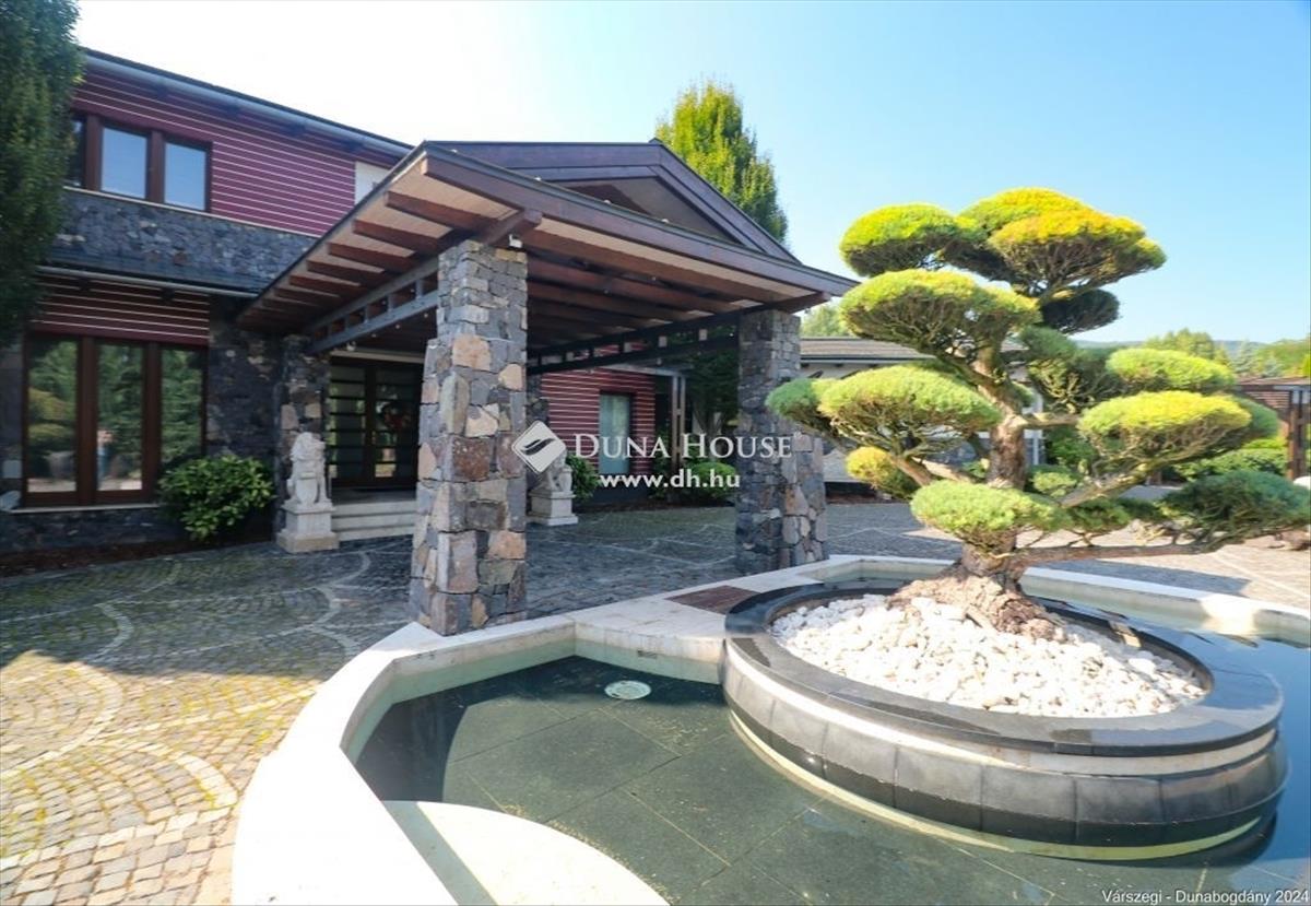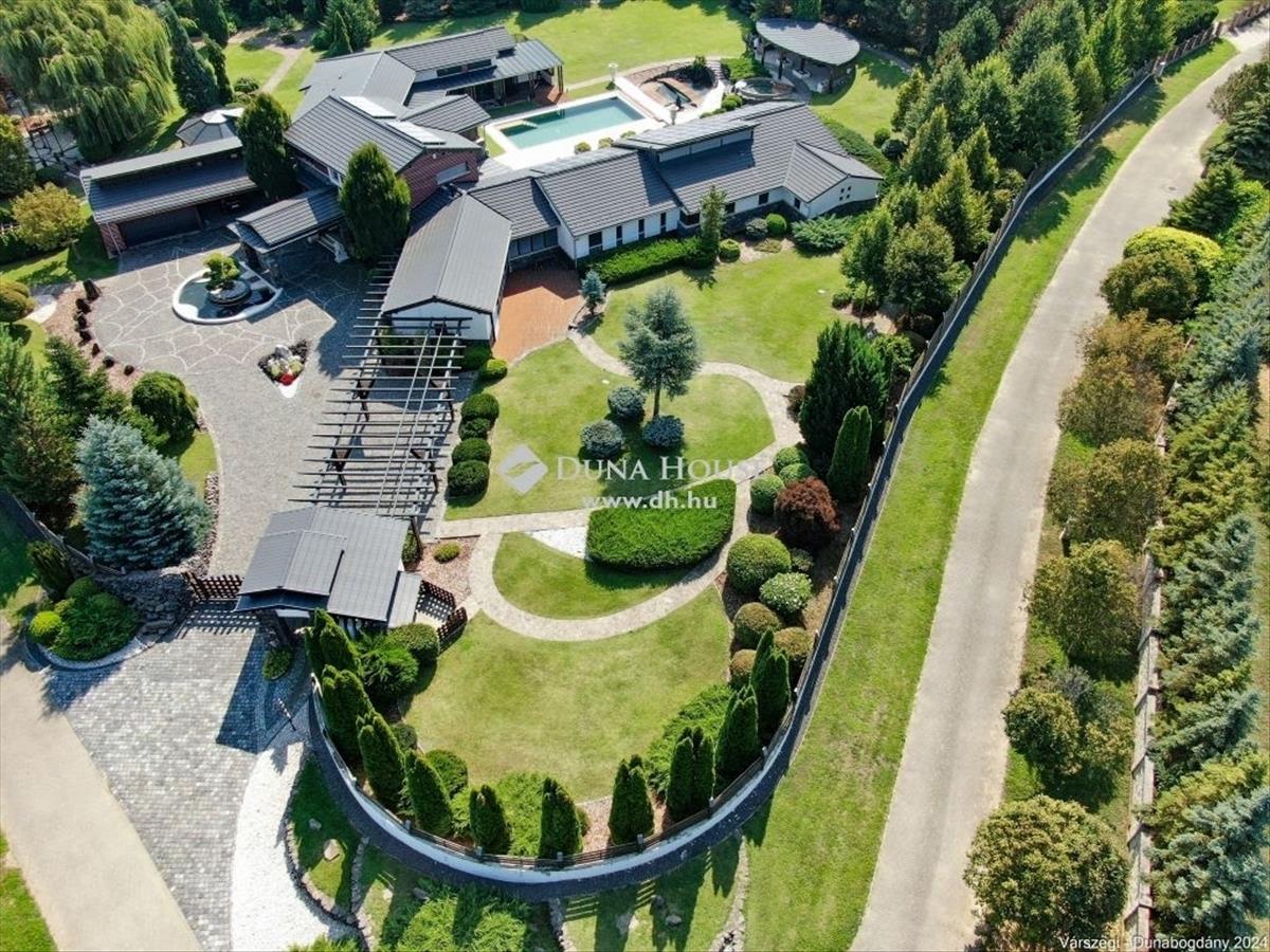 Éteri csendet, harmóniát, a természettel összeolvadó életet kedvelők figyelem! Dunabogdány-Bogonhát majorban eladóvá vált ez a csodálatos bírtok 8500 nm-es telken, mely teljesen körbekerített. Az ingatlan 3 generációs, extra magas műszaki felszereltséggel, különleges hangulatú épületegyüttes. Rengeteg extra kényelmi funkcióval ellátott, óriási kültéri medence, jacuzzi és szaunaház, gyönyörű parkosított kert található meg. a telken található főépület egy egyedi tervezésű luxus kialakítású, minden igényt kielégítő, összesen 3 lakrészre tagolható, több generációs családi ház, mely alapvetően földszintes kialakítású, kis részében van csak emeleti szintje, ahol egy társalgó kapott helyet. a kis méretű pinceszinten gépészeti helyiség van. Az épület 2010-ben épült, az akkori kor igényeit messze túlszárnyaló gépészeti, esztétikai, műszaki tartalommal. a ház karbantartása, állagmegóvása folyamatos, rajta meghibásodásra, vagy állékonyságát veszélyeztető probléma nincs. a telken külön építményként került kialakításra egy szaunaház, több tároló és kiszolgáló építmény. a ház déli, belső udvarán medence, jakuzzi került, melyek az átlagostól jóval nagyobb kialakításúak. a házban összesen 3 lakrész, 7 szoba, egy nagy hall, 4 nappali, 4 fürdőszoba, 3 konyha, több wc és számos kiszolgáló helyiség kapott helyet, illetve kapcsolódikhozzá egy 88 nm-es garázs is, mely 4 gépjármű egyidejű parkolására ad lehetőséget. Az épület stílusa egyedi, leginkább a természetes anyaghasználat emeli magas szintre, ugyanis nagy felületeket burkoltak természetes kővel, faanyagokkal. Mindezeket figyelembe véve, egy renkívül tudatos, és élménygazdag épületegyüttes kerülhet az új tulajdonos birtokába. Várom megtisztelő megkeresésüket akár hétvégén is!Irányár: 1999000 EUR