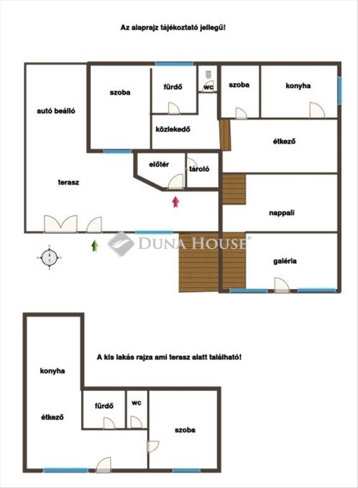 A nappaliból egyedi állógaléria (kb. 2 M belmagasság)Több szinteltolás – izgalmas térélmény~ Helyiségek:Alsó lakrész: külön bejáratú, egyszobás, összkomfortosFelső lakrész: előszoba, közlekedő, szoba, fürdő, wc, félszoba, étkező, konyha, nappali, galéria~ Telek és udvar:Két utcára nyíló bejárat – több autó számára is kényelmesEnyhén lejtős, gondozott udvar50 m²-es teraszKülső tárolóhelyiségKiváló elhelyezkedés: csendes utcában, mégis könnyen elérhetők a szükséges szolgáltatások.