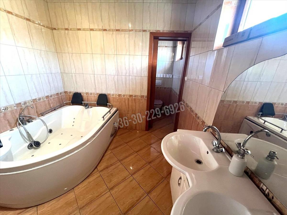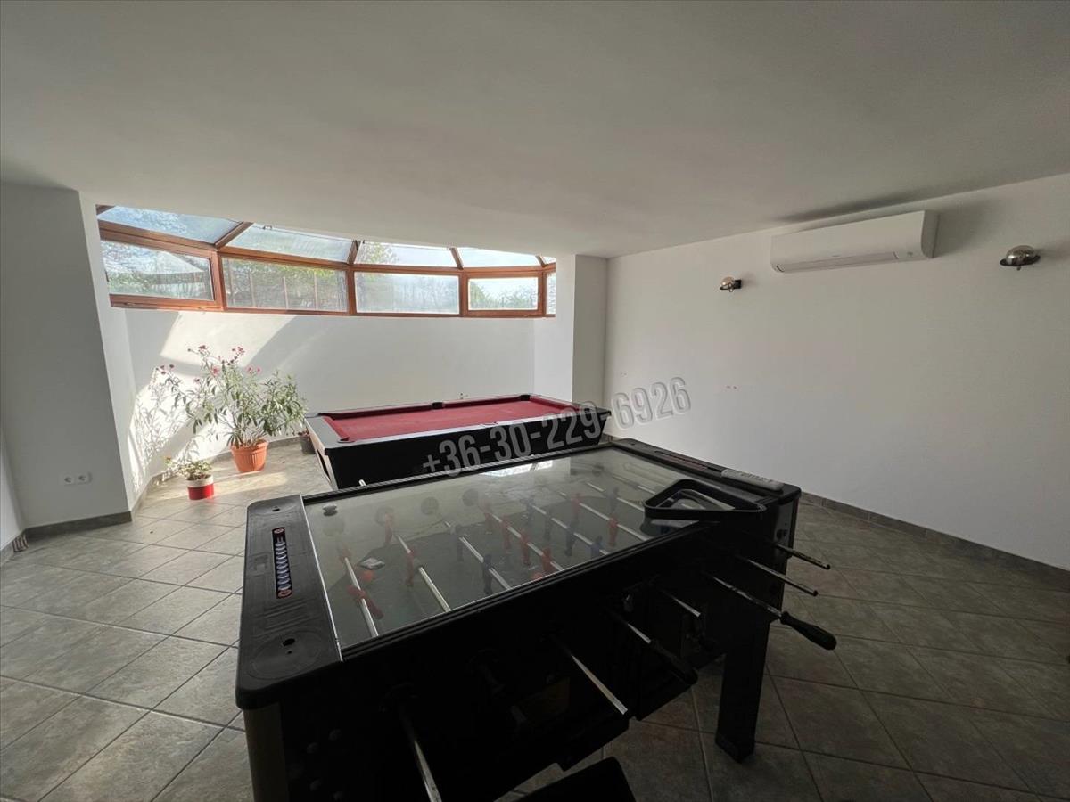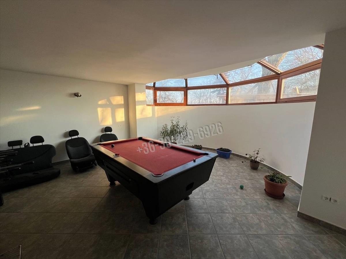 Alsó szint: biliárdszoba, fürdőszoba wc-vel, kazánház, tároló, 2 gépjármű elhelyezésére alkalmas garázs.