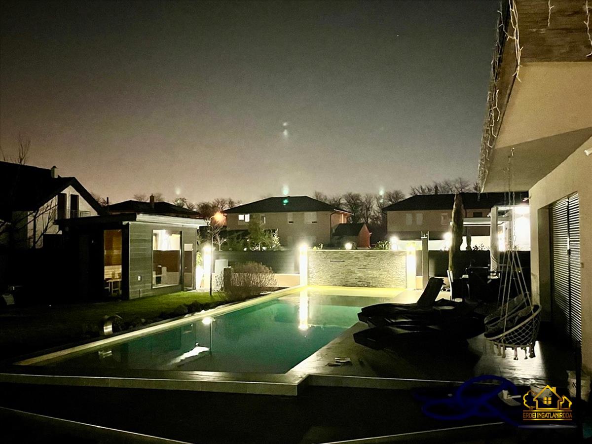 •15 × 4 méteres LED-világítású, fűthető medence, beépített nyakmasszírozó vízesés
