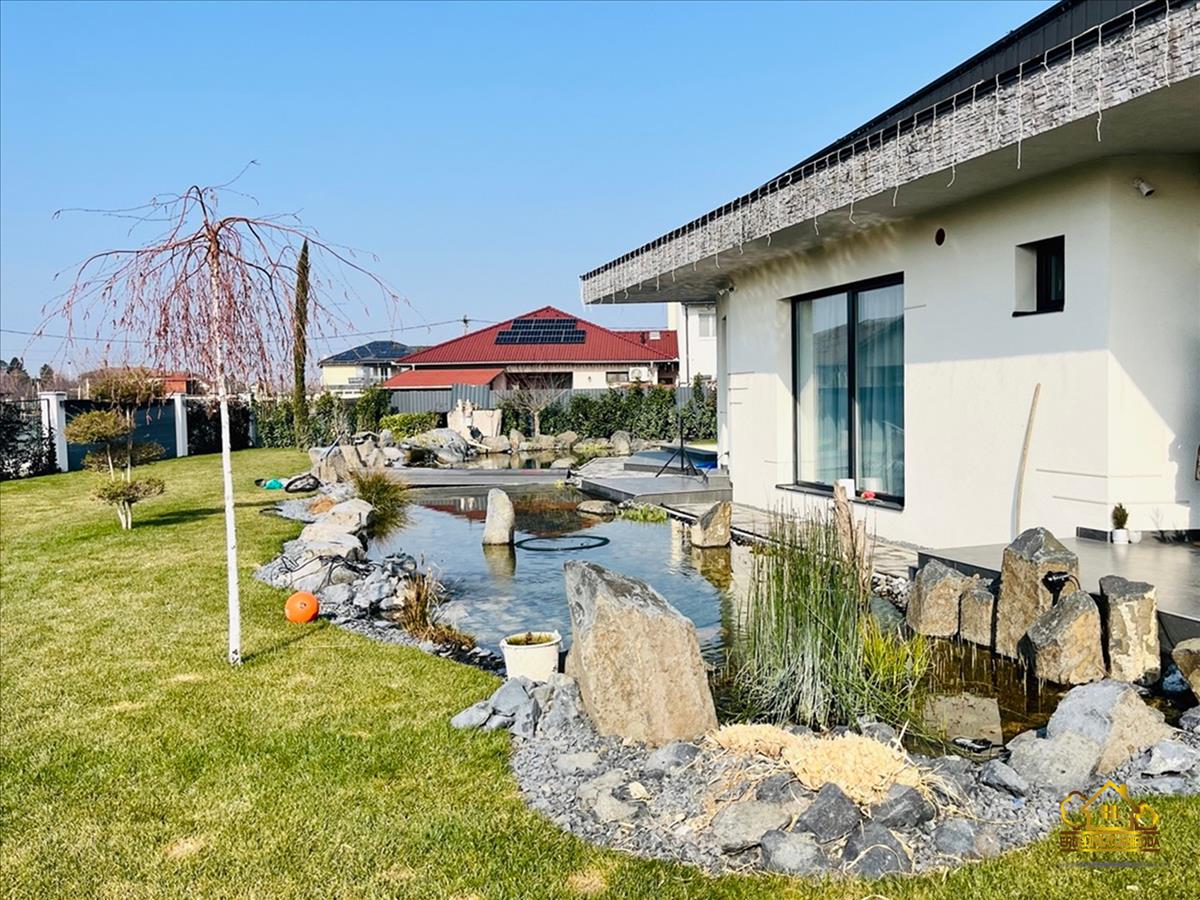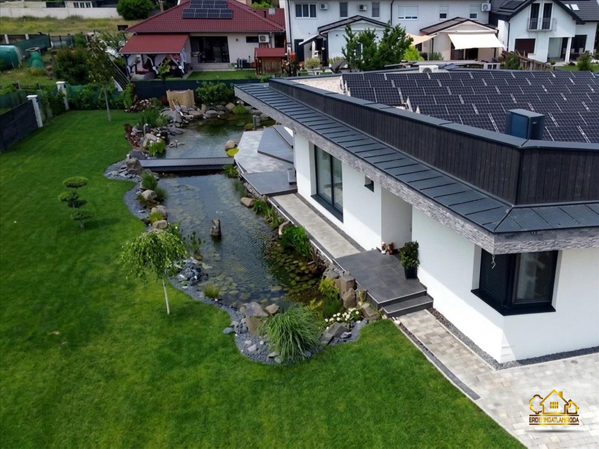 A parkosított, óriási 1023 m2-es kert központi eleme a különleges, öntisztító dísztó három csobogó vízeséssel, vízililiomokkal és közel kétszázféle növénnyel. a nagyméretű, LED-világítású medence nyakmasszírozó-vízeséssel és a mellette elhelyezkedő kerti szauna valódi wellness hangulatot teremt.