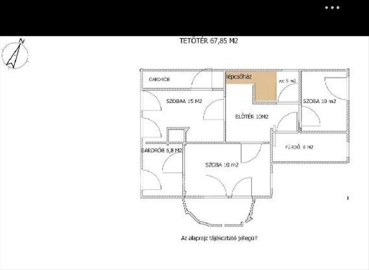 - tetőtér beépítettsége 100 % amely alapterülete 67, 85 m2 és a helyiségei: 3 szoba, fürdőszoba, tároló, közlekedő.