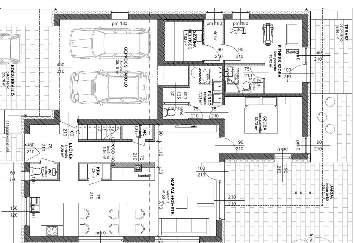 A földszinten előszoba, wc, am. Konyhás-étkező-nappali, kamra, közlekedő, tároló, hálószoba mely fürdőszoba kapcsolattal rendelkezik, illetve egy külön bejáratú 28 nm-es lakás és a duplagarázs található.