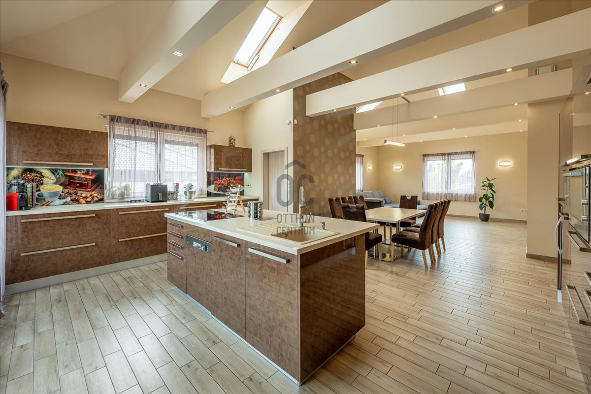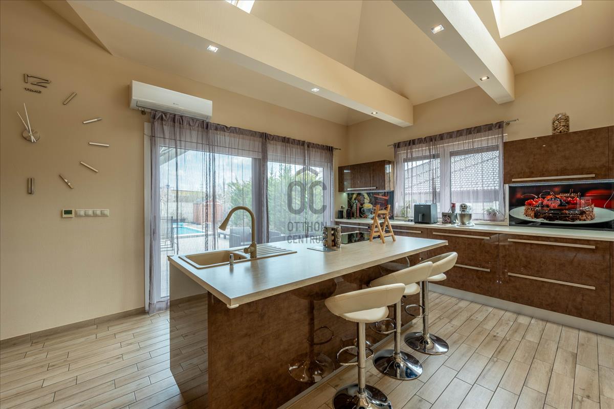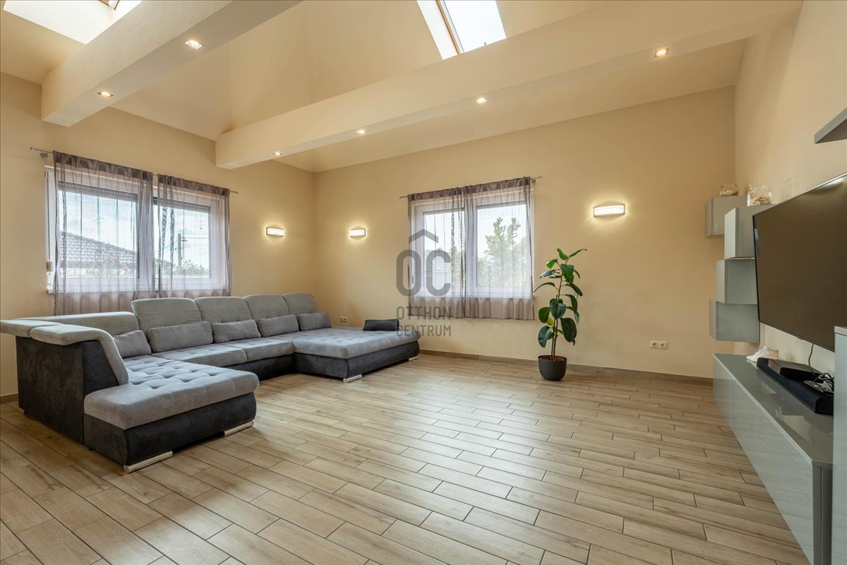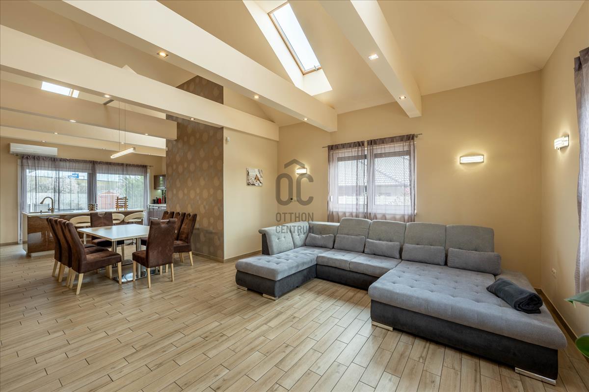 Az ingatlan egy gondozott, 800 m²-es telken helyezkedik el, összesen 242 m² lakótérrel, amelyet további 60 m² beépített tetőtér egészít ki. a ház egyik legkülönlegesebb tere a közel 80 m²-es amerikai konyhás nappali, közel 6 méteres belmagassággal és elektromos tetőablakokkal, amely rendkívül világos és tágas életteret biztosít.