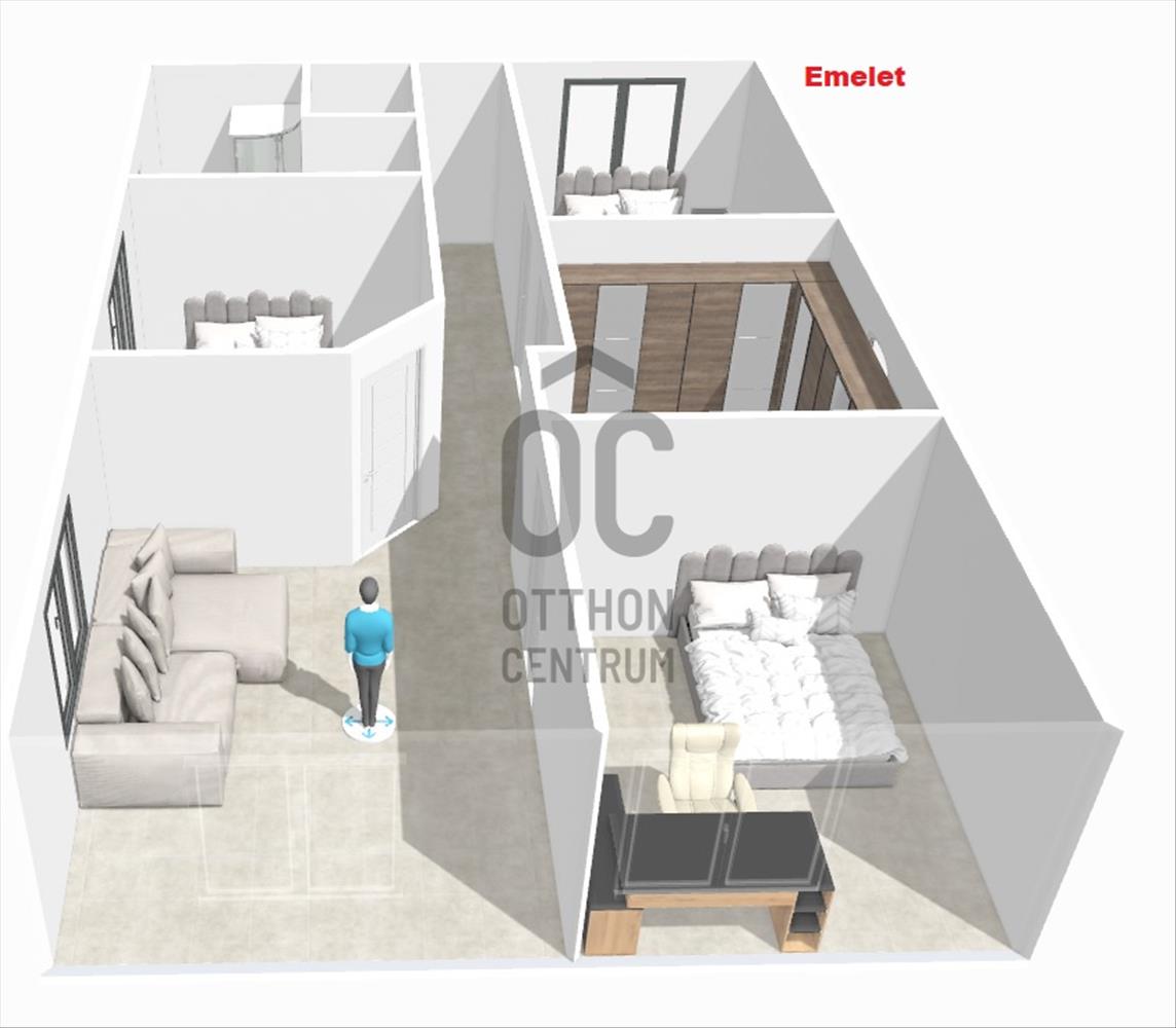 Az emeletre kényelmes lépcső vezet fel, ahol három hálószoba, gardrób, fürdőszoba és külön wc került kialakításra. Egy kisebb teakonyha is helyet kapott ezen a szinten, ami ideálissá teszi az ingatlant kétgenerációs otthonként való használatra is. a tetőtéri szobák mindegyikéből lenyűgöző panoráma nyílik a Dunára, így a természet közelségét minden évszakban élvezhetjük.