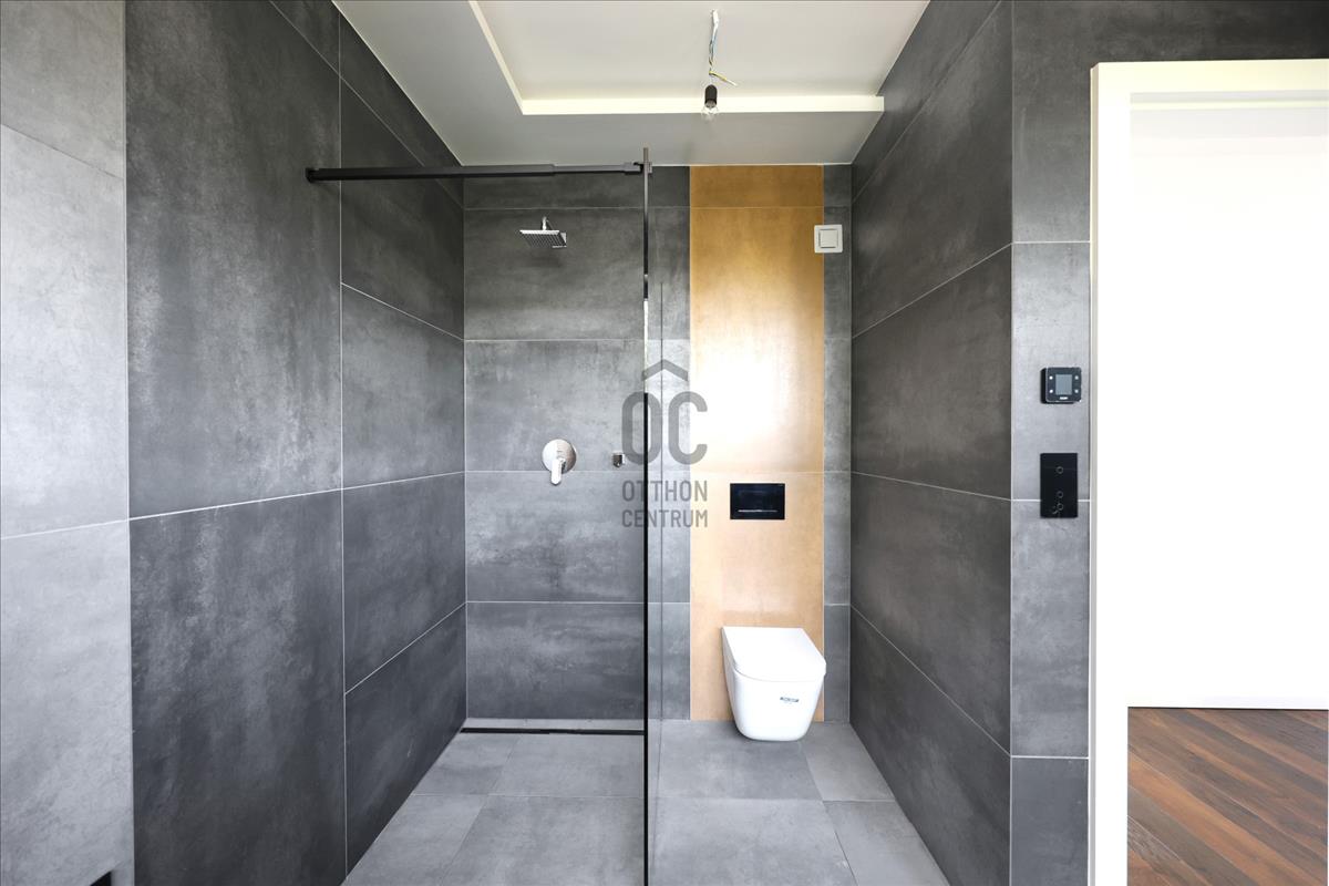 Duplakomfortos, mindkét szinten fürdőszoba, alsó szinten zuhanyzóval ellátott, felső szinten zuhanyzó és kád is kapott helyet.