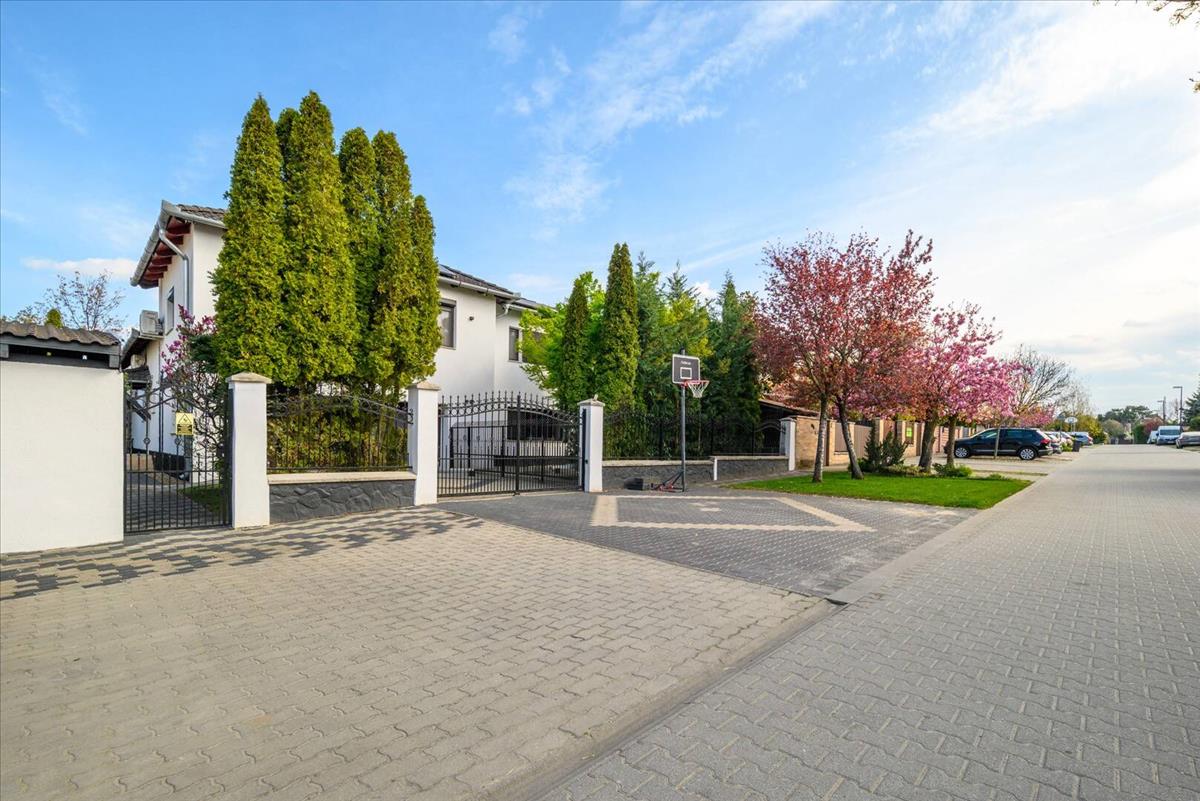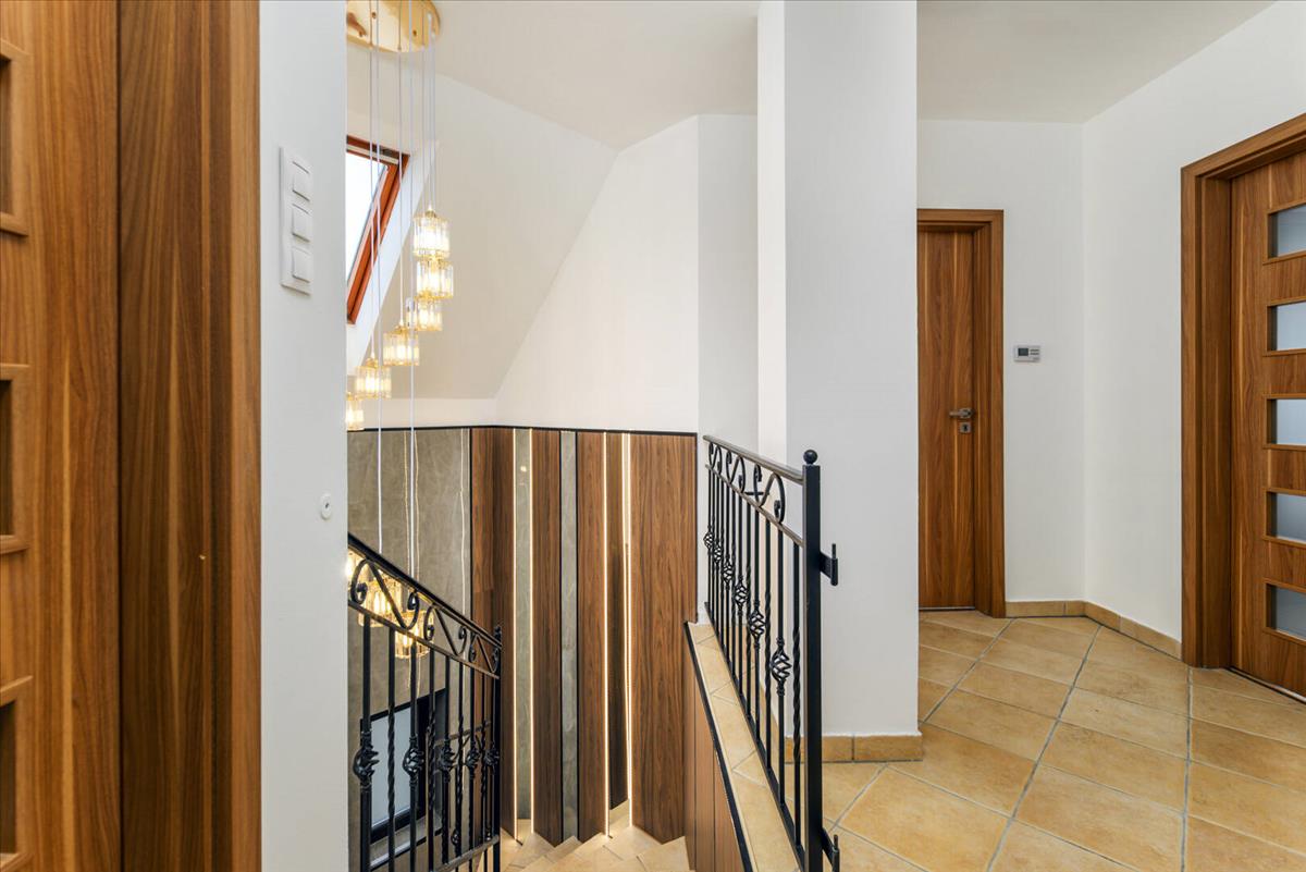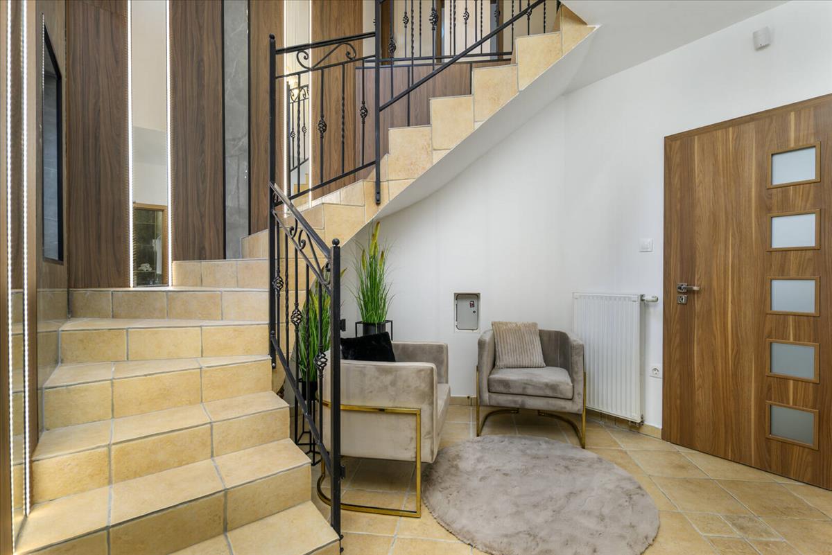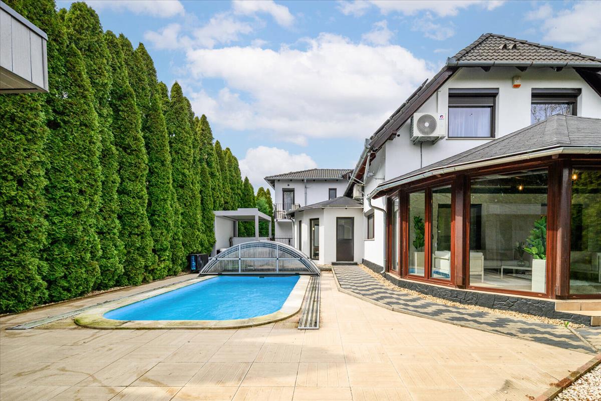 Ez a kétszintes, impozáns méretű családi ház már az érkezés pillanatában különleges atmoszférát teremt. a gondosan kialakított előkert, az elegáns kovácsoltvas kapu és a rendezett környezet előrevetíti mindazt a minőséget, ami odabent vár.