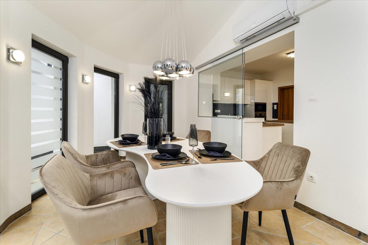 A praktikumról sem feledkeztek meg, egy külön háztartási és gépészeti helyiség biztosítja az otthon zavartalan működését, diszkréten elrejtve a műszaki hátteret, miközben a lakótér megőrzi letisztult eleganciáját.