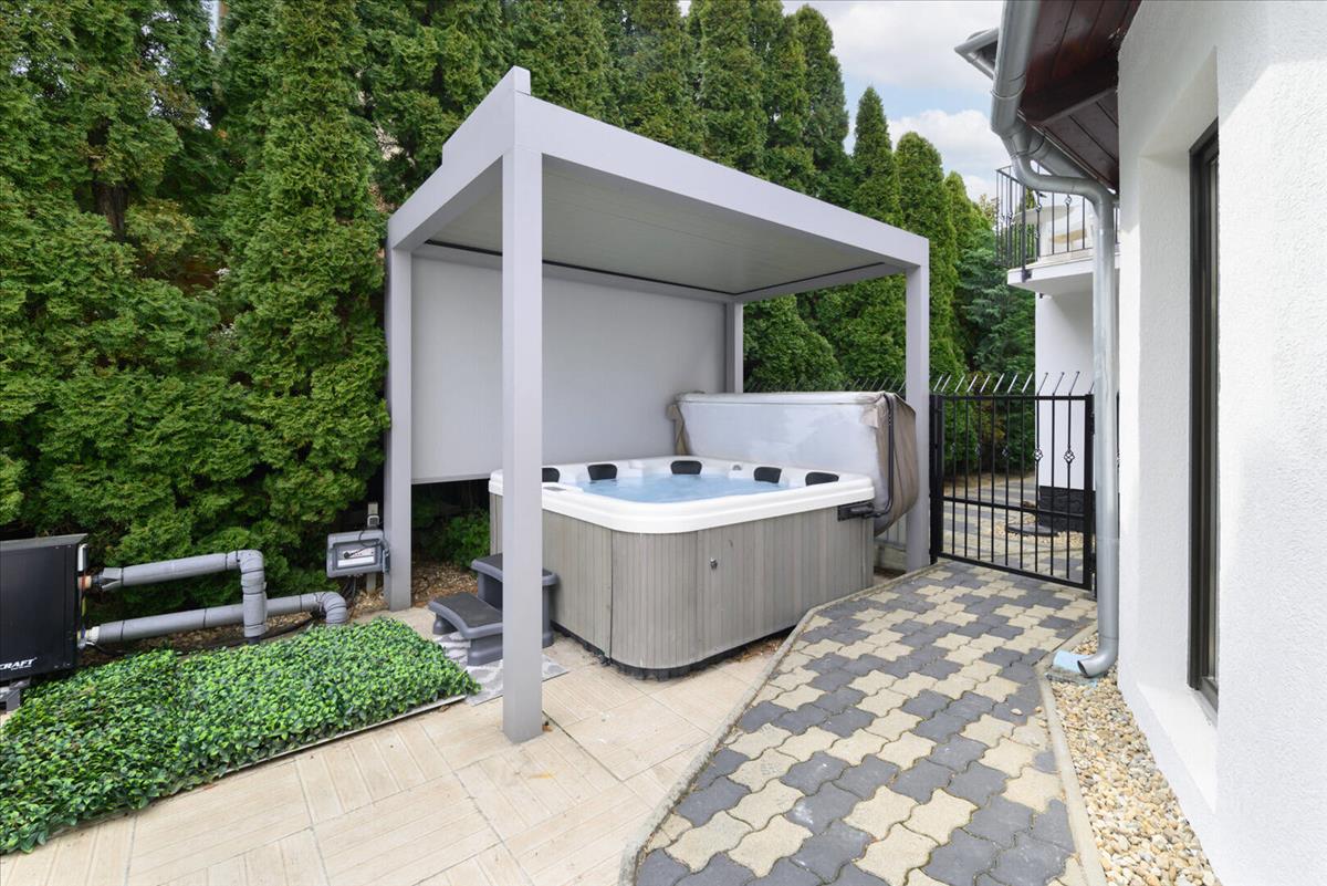 A kert különleges értékét a saját wellness részleg adja, amely magában foglalja a medencét, jakuzzit és szaunát, így az otthon kényelme új dimenzióba lép.