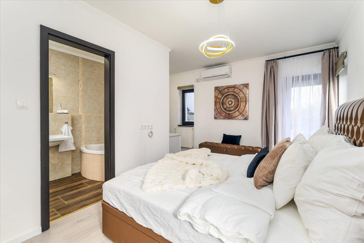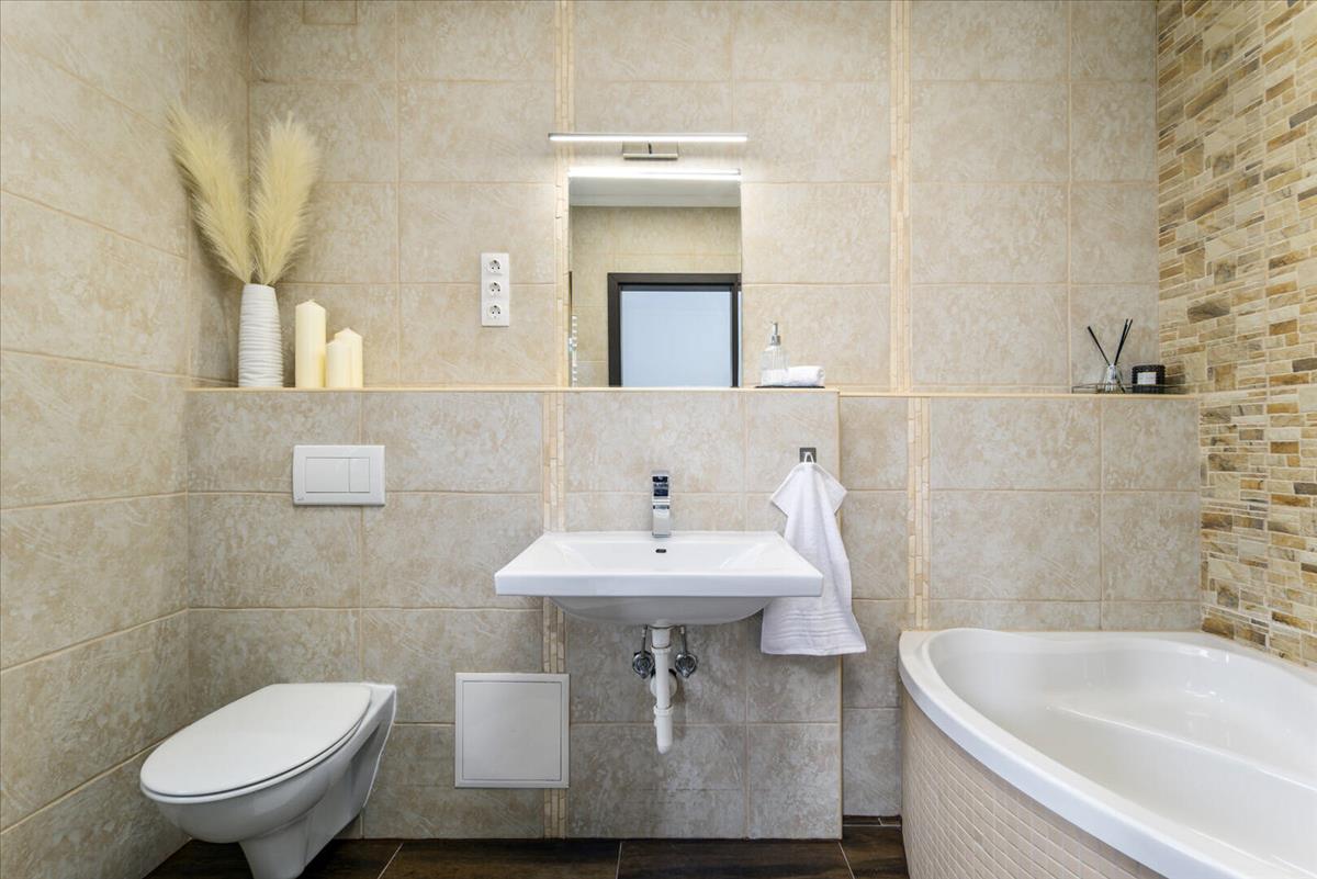 A fürdőszoba valódi különlegesség: tágas, igényes burkolatokkal kialakított tér, ahol a sarokkád és a természetes fény együtt teremti meg a spa hangulatot. Ez a helyiség nem csupán funkcionális, hanem a mindennapi kikapcsolódás tere.