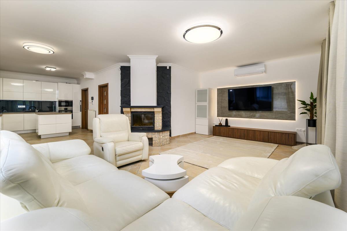 A központi élettér a ház szíve. a nappali, az étkező és a konyha egysége tökéletesen átgondolt – egyszerre tágas, mégis meghitt. a kandalló melege, a lágy fények és a természetes színek olyan atmoszférát teremtenek, ahová jó megérkezni egy hosszú nap után.