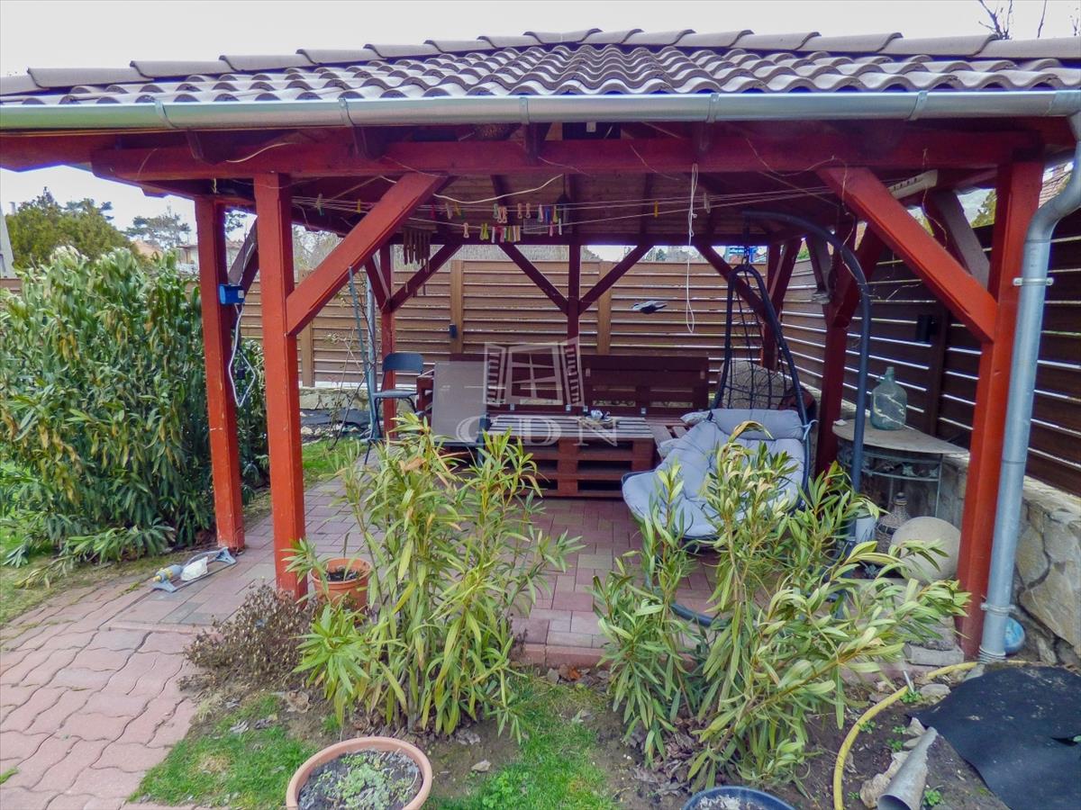 A zárt udvaron 3 autóval meg lehet állni, ebből 2 fedett, az elektromos hálózat felbővített (3*16 a), a kertben egy nagy terasz (20 nm ), szaletli (16nm ), tároló (20 nm ), bográcsozó kapott helyet. Az öntözés fúrt kútról megoldott, a kerítés gondozásmentes.