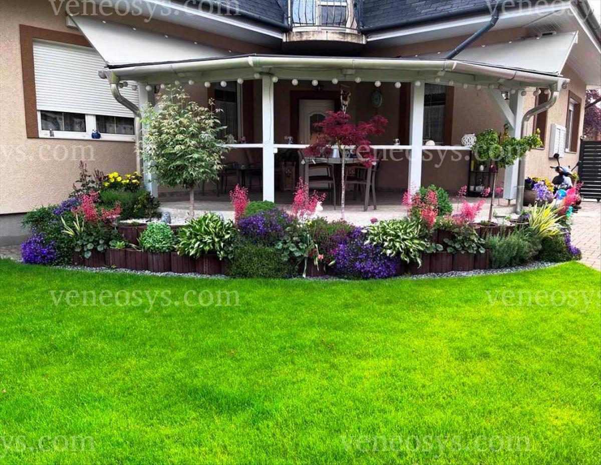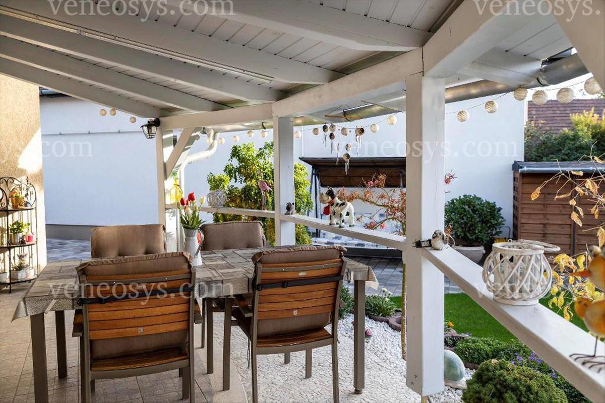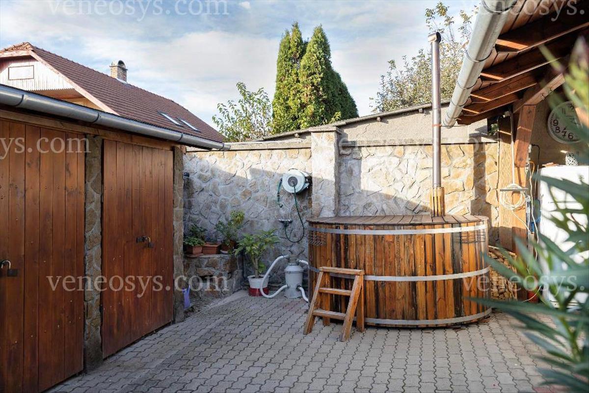 Itt is szembesülünk a tulajdonosok jó ízlésével, praktikus gondolkodásával. Beépített kerti sütögető, bográcsozó, kerti dézsa, nyári konyha, szerszámos kamra, fa tároló szolgálja a kényelmet.