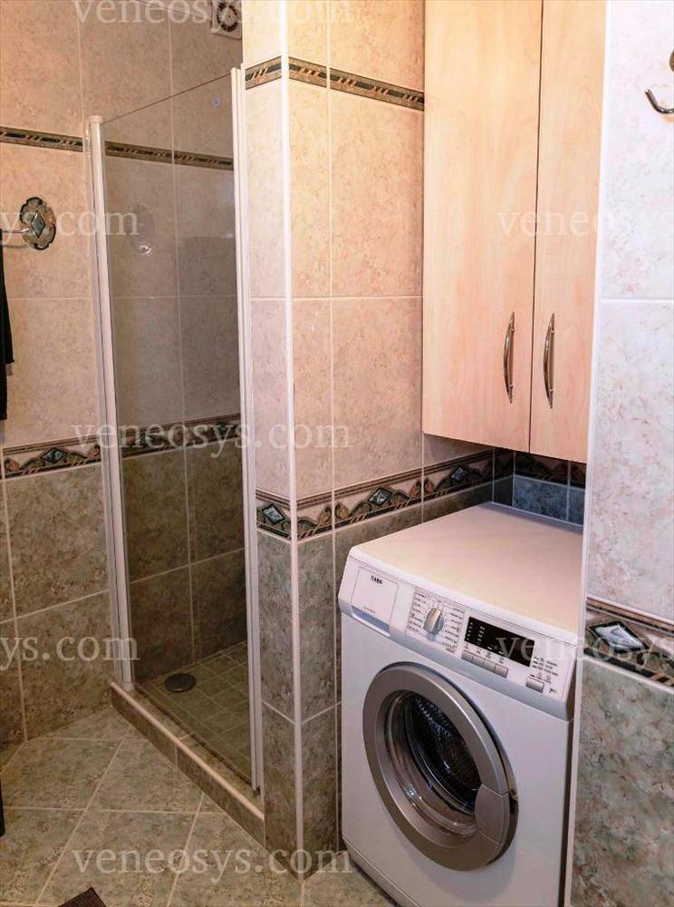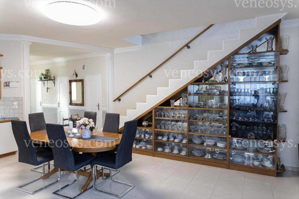 Szemben egy 3 nm-es tároló van ahonnan egy 11 nm-es pincébe tudunk lejutni, majd egy 3 nm-es wc bidével és kézmosóval és egy 6 nm-es háztartási helyiség ahová a 23 nm-es garázsból is bejuthatunk, jobbra pedig 40 nm-es amerikai konyhás nappali egy használatban lévő szép cserépkályhával és a lépcső alatt beépített vitrines szekrénnyel.
