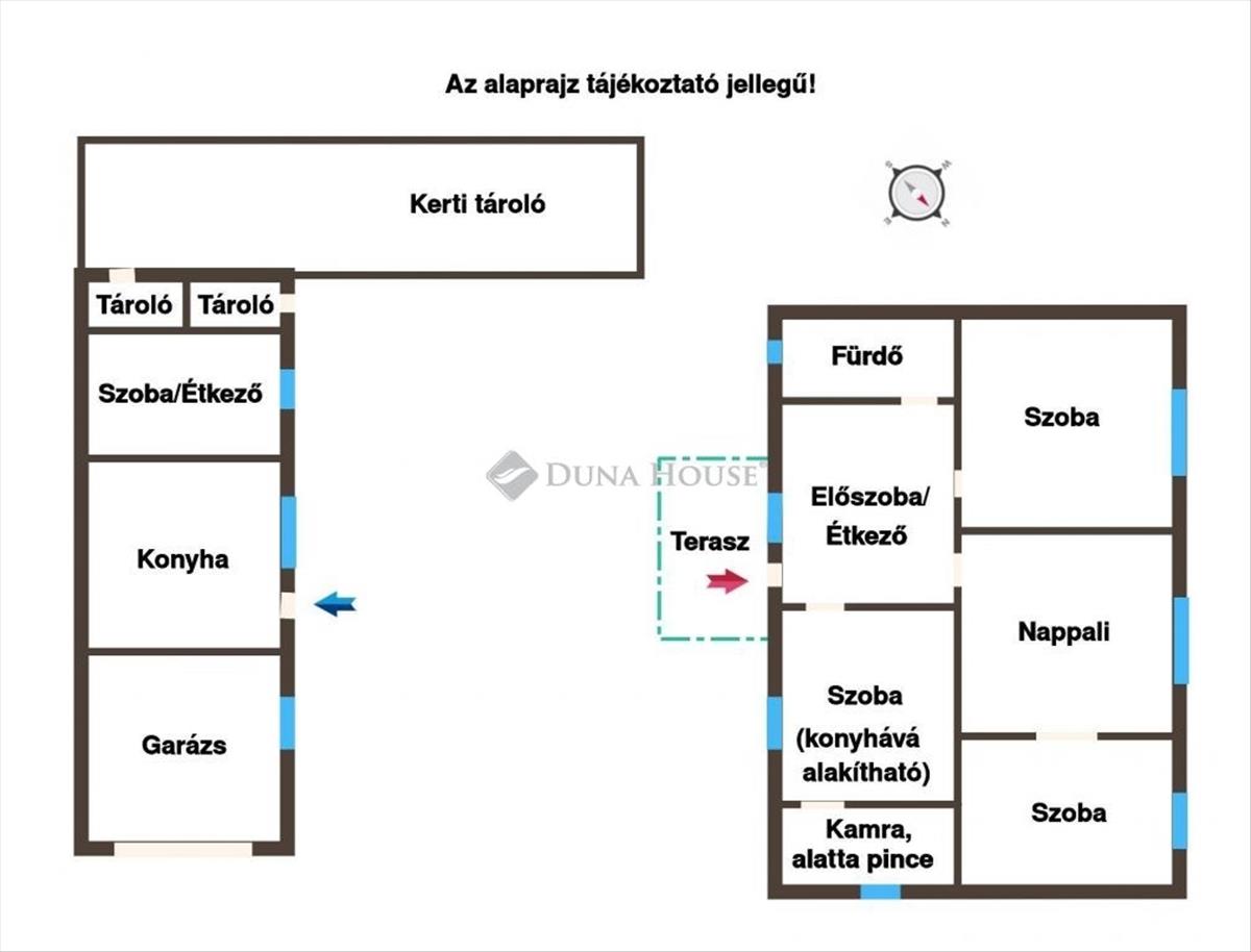 A melléképületben konyha, szoba, garázs és külön tároló kapott helyet. a közművek könnyen bővíthetők, így fürdőszoba is egyszerűen kialakítható, aminek köszönhetően az ingatlan akár két önálló lakóegységként is funkcionálhat.