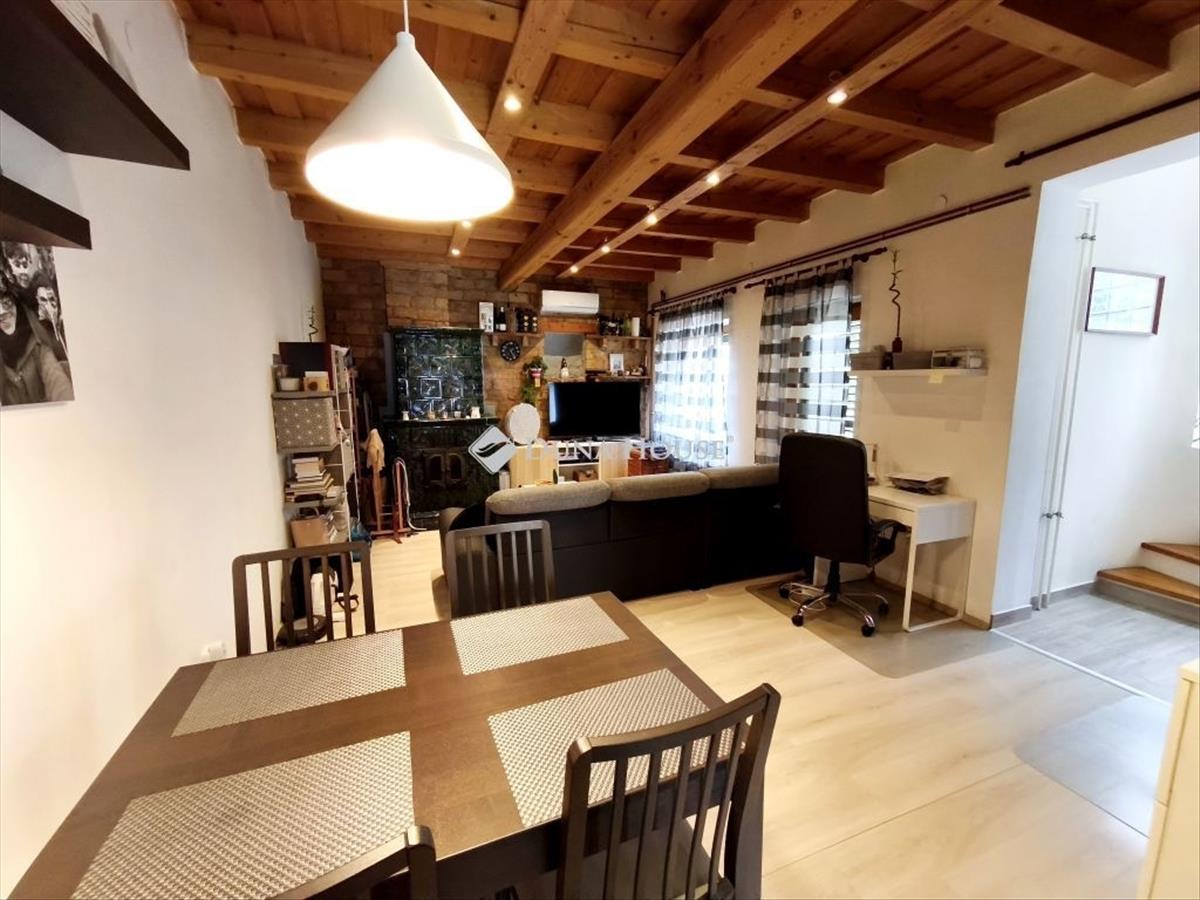 - Tágas, világos nappali, ahol a látványos mestergerenda és a fa mennyezet egyedi hangulatot kölcsönöz a térnek.