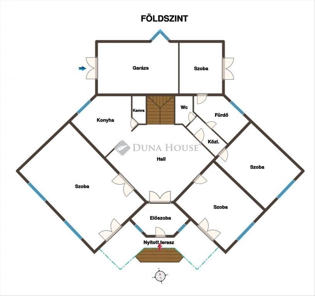 - Földszint: 4 szoba, hall, konyha, kamra, fürdő, wc, előtér, közlekedő, garázs