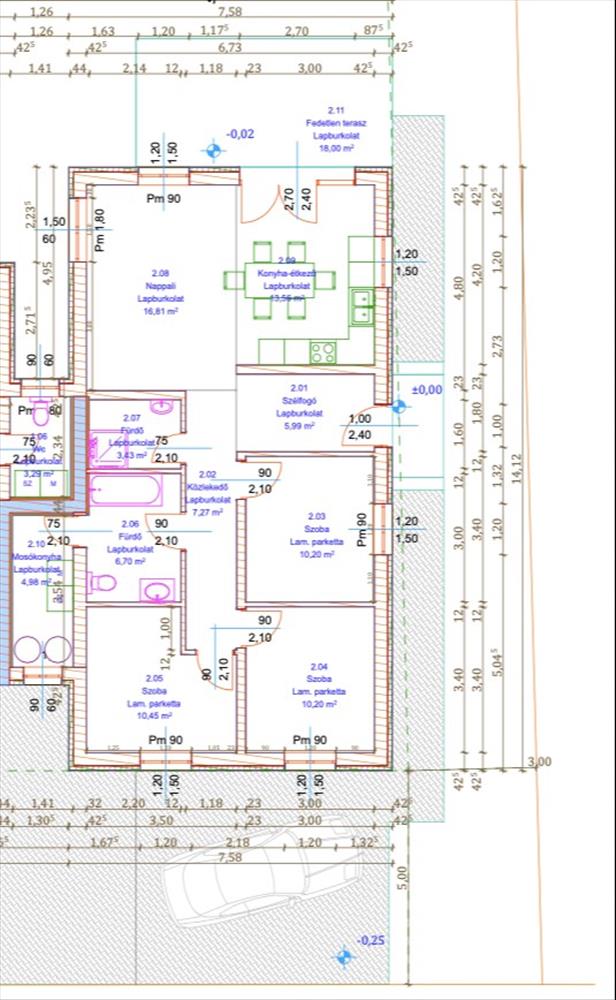 Az ingatlan praktikus, jól átgondolt alaprajzzal rendelkezik. a lakás nettó alapterülete 89, 59 m², amelyhez egy 18 m²-es terasz kapcsolódik; a hirdetésben szereplő számított alapterület 98 m², mivel a terasz fele beleszámításra került. a lakáshoz 353 m² saját telekterület tartozik, valamint további 32 m² közös használatú terület, amely az autóbeállók kialakítását szolgálja.