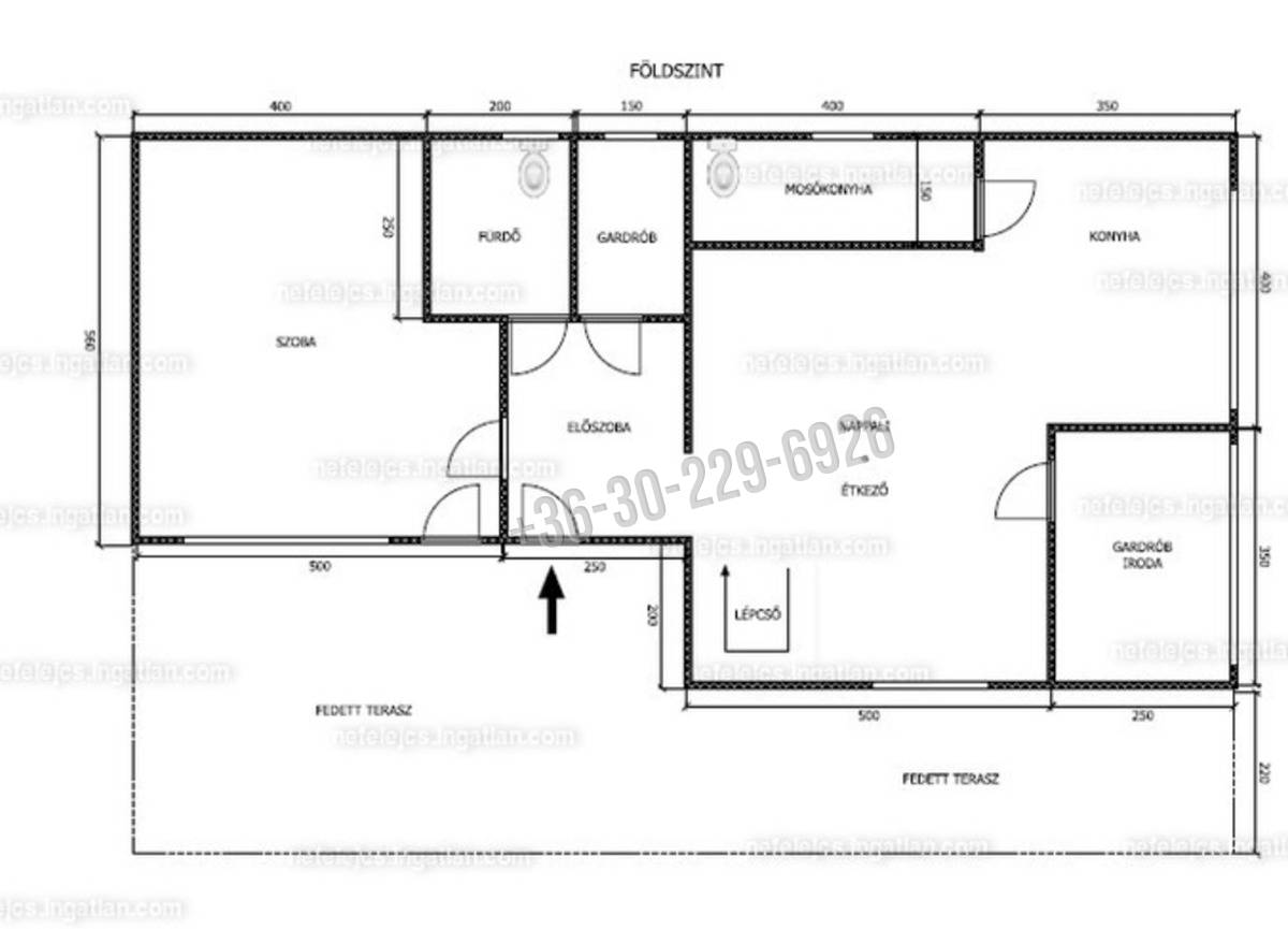 Elrendezése földszint: előtér, amerikai-konyha-nappali (a beépített konyhabútor az eladás részét képezi), szoba, 2 gardrób, kamra, fürdőszoba wc-vel.