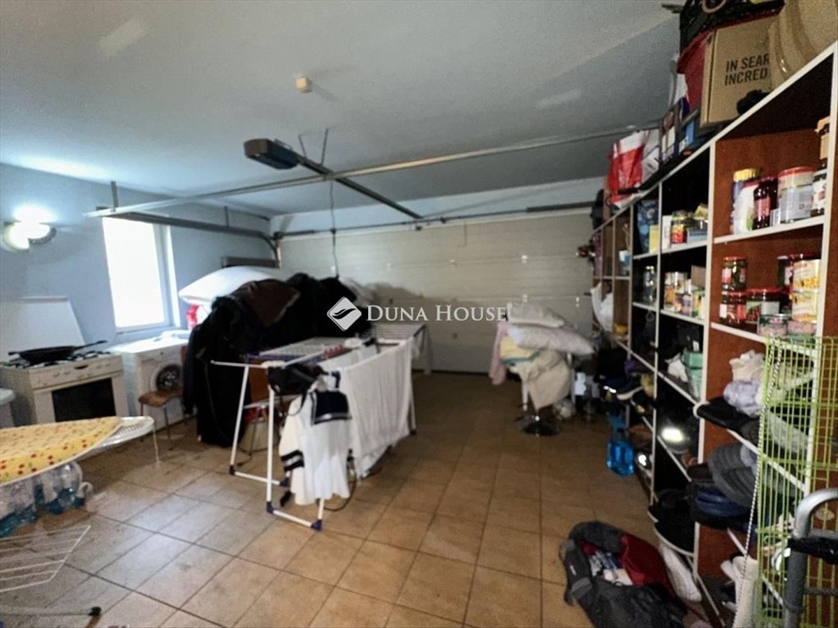 A garázs két autónak nyújt helyet, a beállást az elektromos garázsajtóval tették kényelmessé. Előtte a fellhajtón két autóval meg lehet állni, jelenleg a tulajdonosok csak ezt használják, a garázst pedig mindenes tárolóként vették használatba. Ezen a helyiségen is van ablak, így a tágas tér mellett világos és jól szellőztethető.
