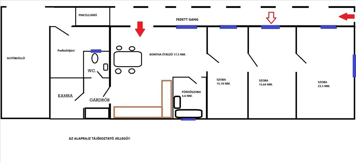A hosszanti elhelyezkedésű ingatlanban 3 egybenyíló szoba, étkező konyha, fürdőszoba, szeparált wc. Mosdóval és kamra található.