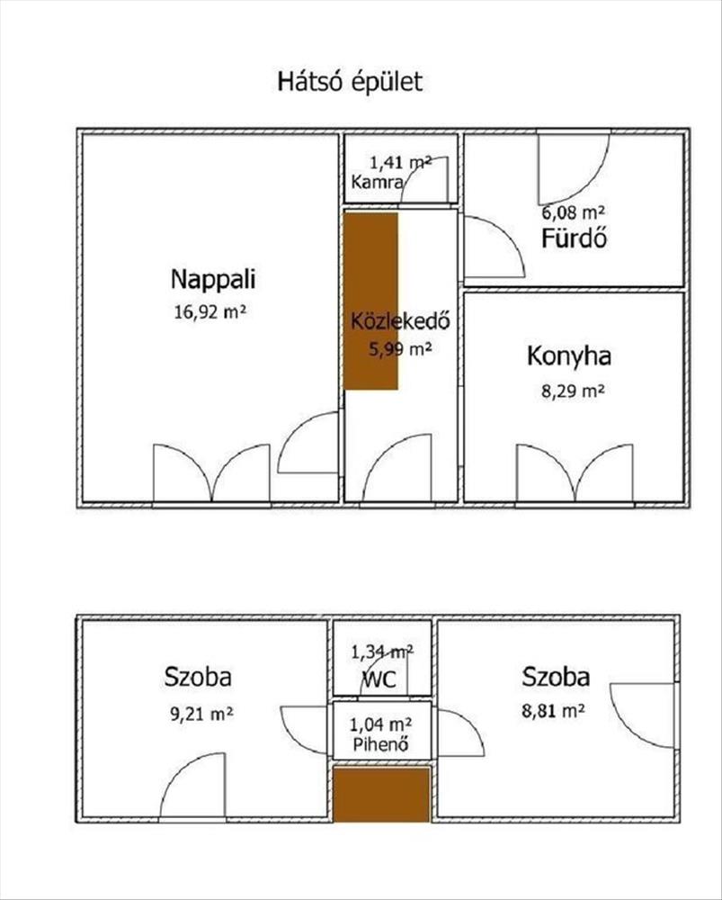 A főépület mögött kapott helyet egy 1984-ben épült, kétszintes, 75 m2-es kisebb családi ház, amely jó műszaki állapotú és akár azonnal használható lakóegységet biztosít. Az alsó szinten nappali, konyha - étkező, fürdőszoba és kamra található, míg a tetőtérben két szoba és egy wc került kialakításra. Az ingatlan gépészete a kornak megfelelő állapotú, a villamos hálózat bővítése megtörtént, a beépített és gépesített konyha pedig minden alapvető igényt kielégít. a fürdőszoba víz - és szennyvízvezetékeinek, valamint burkolatainak cseréje 4 évvel ezelőtt történt, a központi fűtést pedig egy két éves gázcirkó kazán biztosítja, míg a nyári időszakban klímaberendezés gondoskodik a kellemes hőmérsékletről.