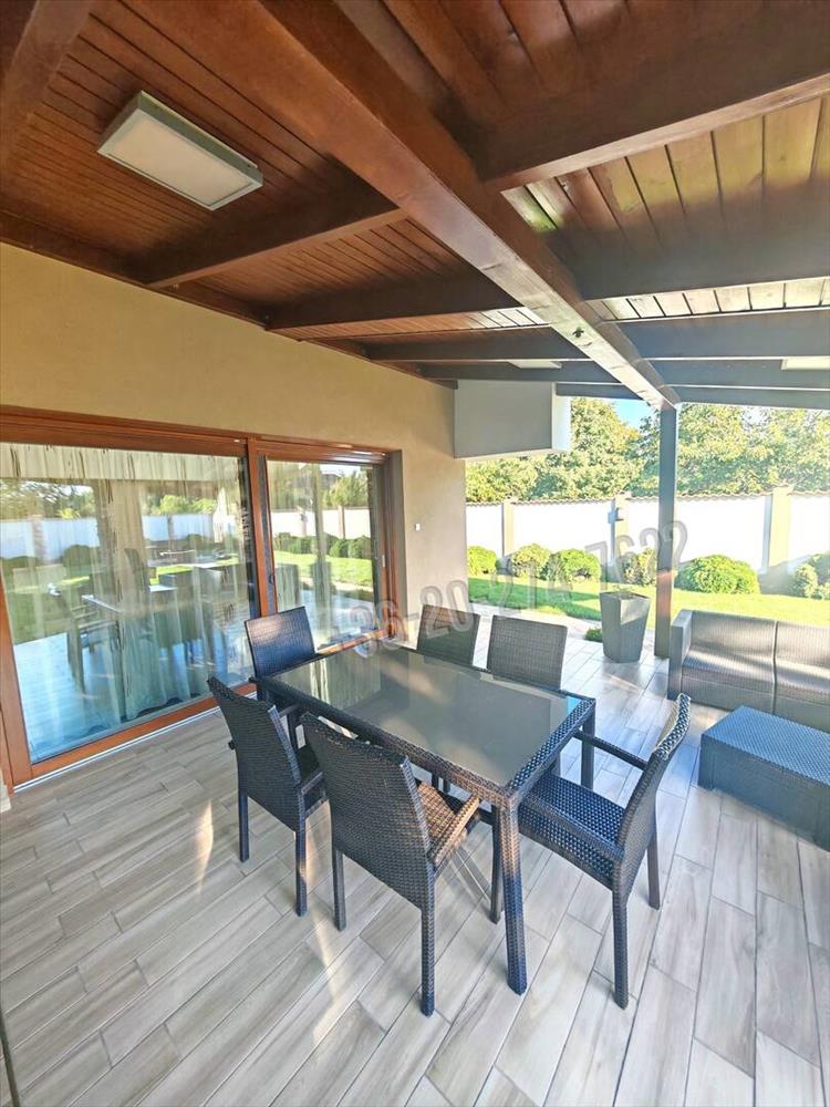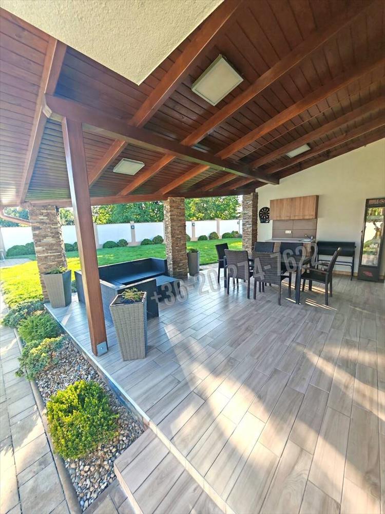 A 758 m²-es telken fekvő, 185, 32 m²-es (ebből 36, 81 m² garázs) újszerű családi ház már első pillantásra magával ragad. a kert rendezett, zöld növényekkel ölelt, térkövezett udvarral, hangulatos nyársalóval – igazi nyugalomsziget.