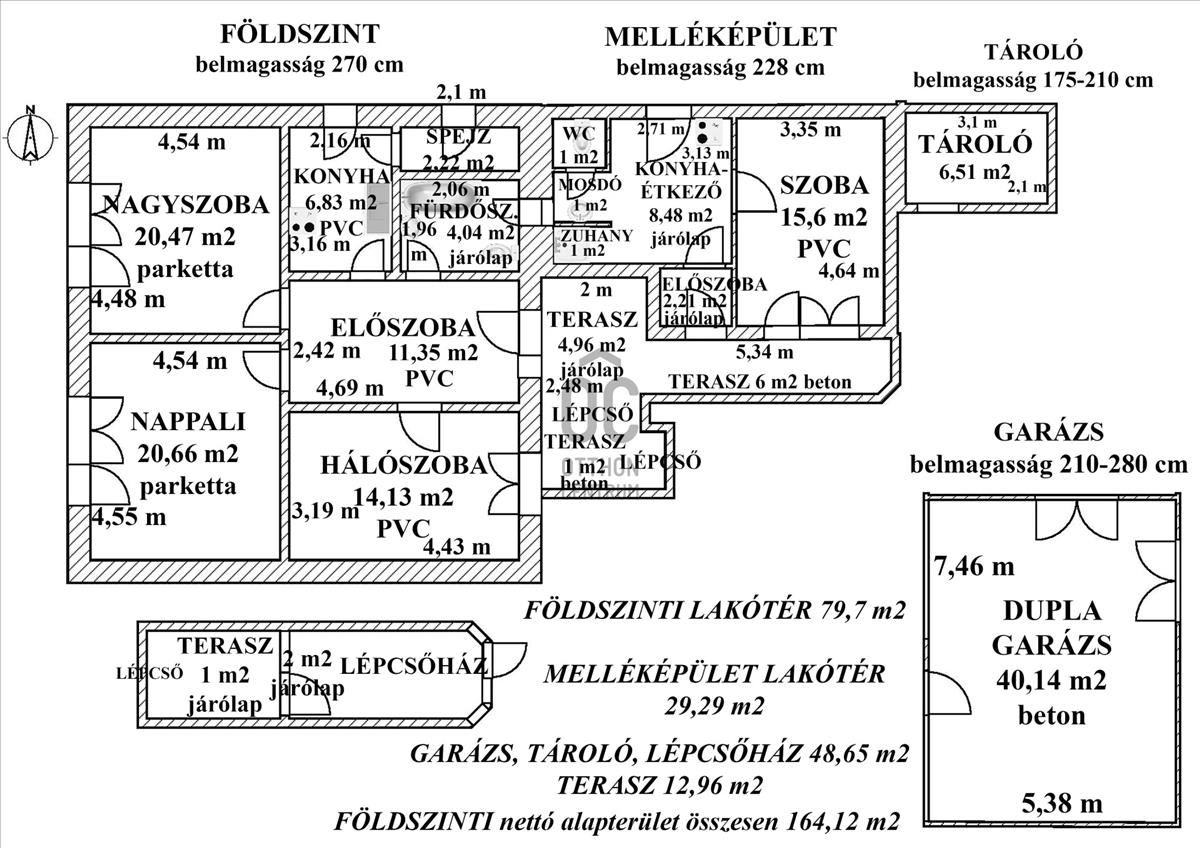 A fentieken kívül a lépcsőház alatti kisebb pinceszinti tároló, egy külön kerti tároló, ólak és a 40 nm-es dupla garázs tartoznak az ingatlanhoz, a bal oldali beálló alatt szerelőaknával. Valamennyi helyiség mérete, burkolata, elhelyezkedése a négy mellékelt alaprajzon megtalálható. a kertben többféle gyümölcsfa, veteményes és beton sütögetők találhatóak, az udvaron pedig fúrt kút. (Az északi telekhatárra a szomszédos háznak gázvezeték szolgalmi joga van bejegyezve, de ez nem vesz el hasznos részt a kertből. )